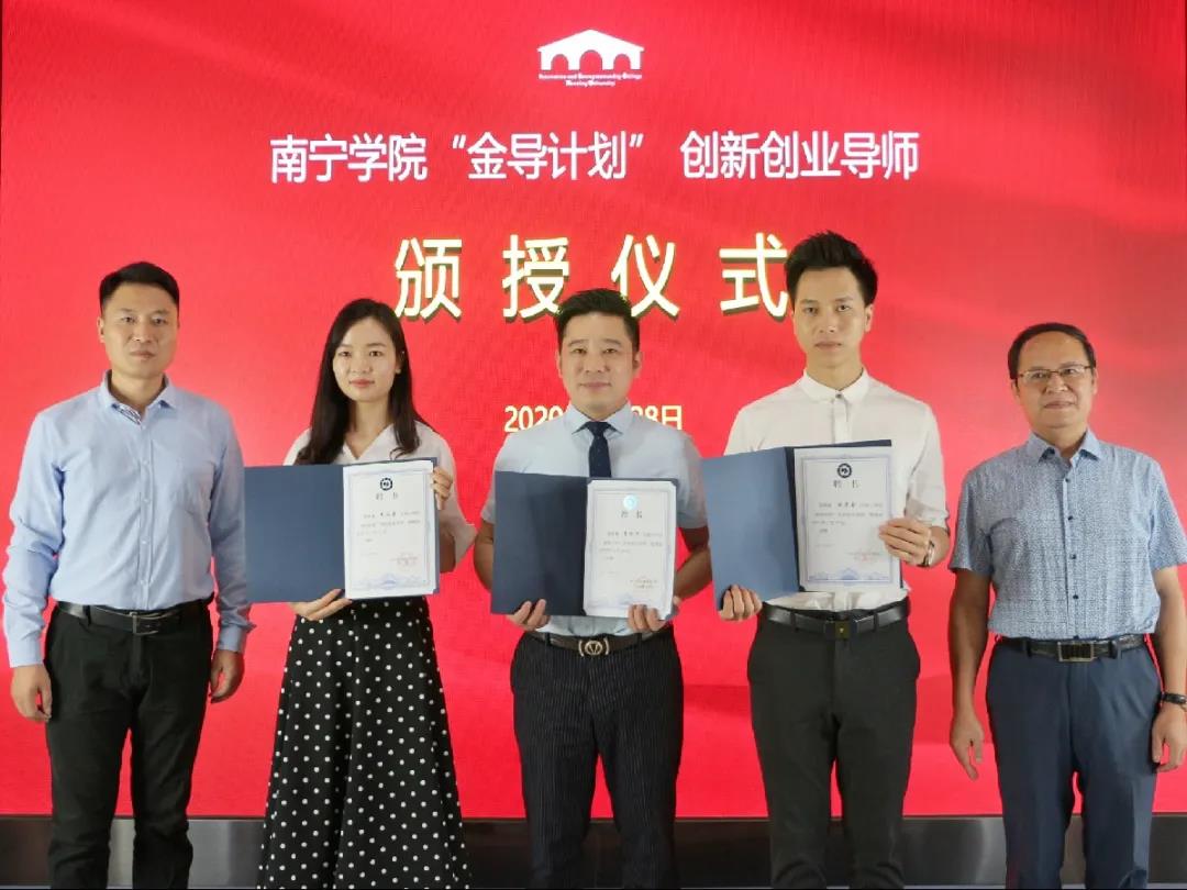 陈雄章副校长为甘昌金、李顺华、文山姿颁发聘书,正式聘任他们为Beat365中文官方网站“金导计划”创新创业企业导师。