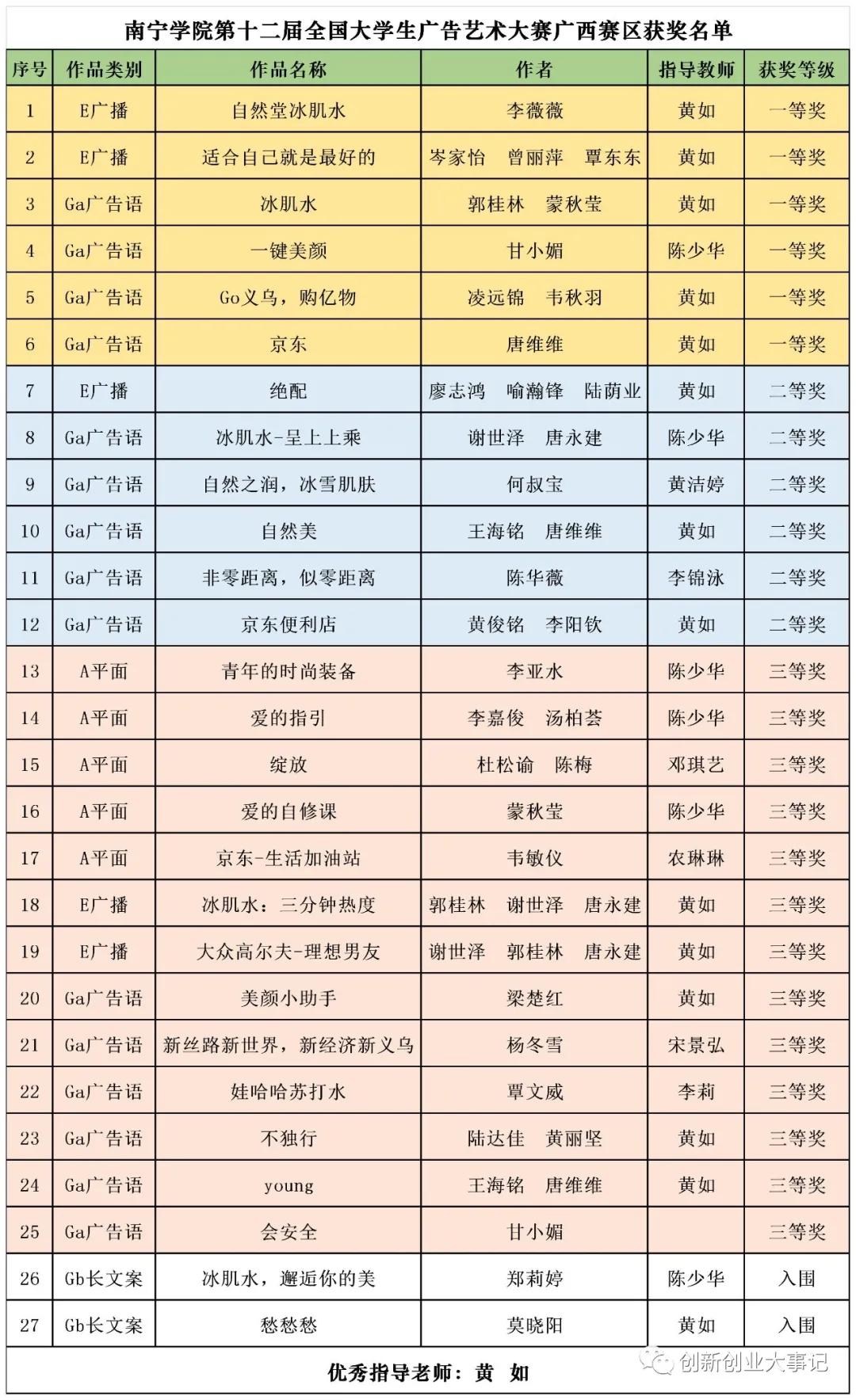 近日,第十二届全国广告艺术大赛广西赛区获奖名单已公布,Beat365中文官方网站获得一等奖6项、二等奖6项、三等奖13项以及入围奖2项,共计27项,黄如老师获优秀指导教师,为我校学科竞赛成绩又增添浓墨重彩的一笔。