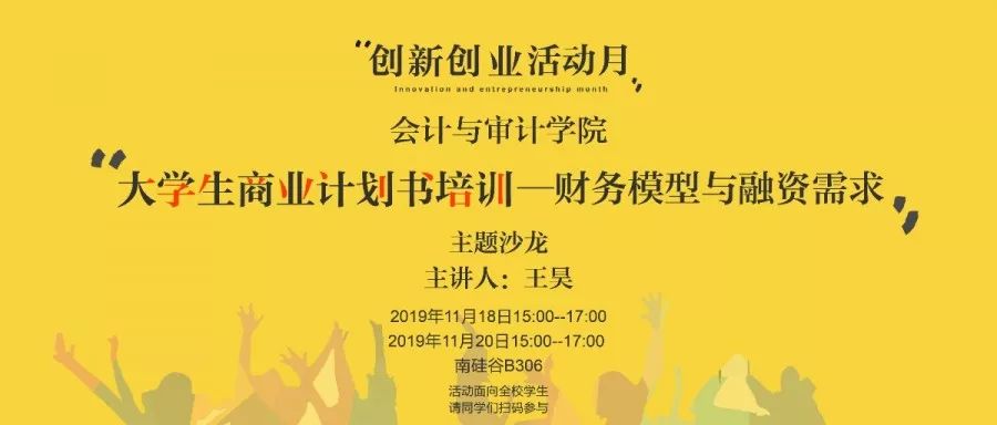 11月18日15: 00,我院于南硅谷B402开展"大学生商业计划书培训一财务模型与融资需求"主题沙龙活动。由王昊老师担任此次活动的主讲人。
