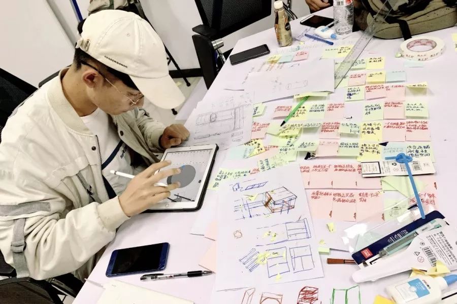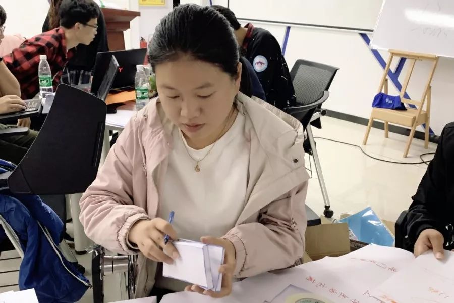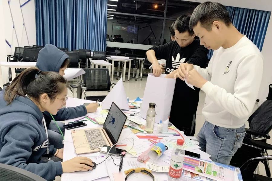 入营同学通过游戏挑选简历的方式组建团队并开展体验营活动。在刘欣蕾老师的引导下,各团队负责人阐述自己团队的创意种子,并根据斯坦福大学设计思维理论,团队成员通过五步拆分的方式共同努力完善团队的创意种子。在现场实践与游戏相结合的方式下,体验营现场气氛火爆,最终现场积分进入三甲的团队有:对点队、“盒”约搭档队、人多势众队。