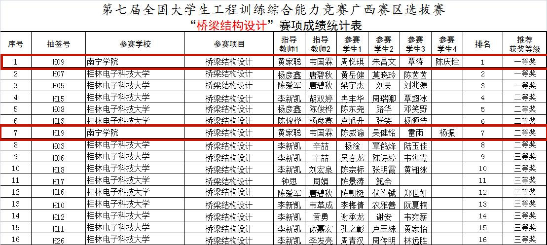 其中,土建学院黄家聪老师、韦国霖老师带领的桥梁结构设计团队以单项比赛第一轮第一名和第七名的好成绩成功晋级第二轮,并通过优异表现,再次以第一名的成绩获得国赛晋级的机会!