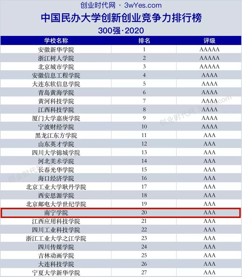 该榜单由创业时代网正式发布,至今已连续第六年,旨在反映中国大学创新创业竞争力水平。榜单通过量化建模及综合加权评分等方法,从创业教育、创业活动、创业潜力、创业人才是各方面对国内民办大学的创新创业竞争力进行评估及评级。