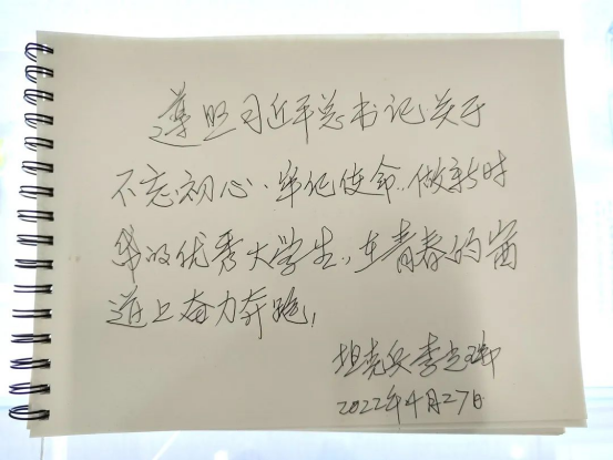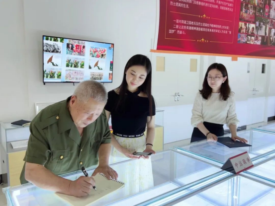 双方在参观“不惑青春”英雄精神传承体验基地的过程中进行了愉快的交流。其中,李光瑞老兵回顾了当年的战争历史事迹,讲述了他在作战中的英勇故事,勉励当代大学生应当扛起英雄精神传承的大旗,并写下寄语:遵照习近平总书记关于“不忘初心、牢记使命”的嘱托,争当新时代优秀大学生,在青春的道路上奋力奔跑。