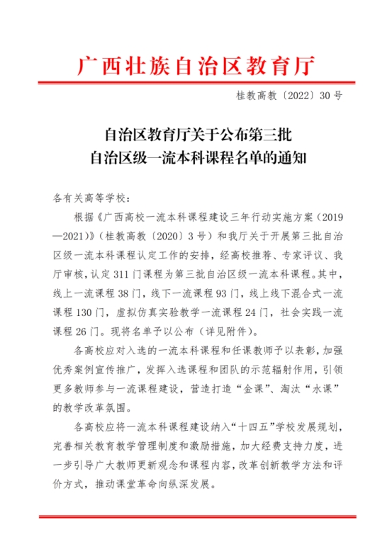 Beat365中文官方网站又一门双创课程入选自治区级一流本科课程!6月15日,自治区教育厅发布《自治区教育厅关于公布第三批自治区级一流本科课程名单的通知》(桂教高教〔2022〕30号),Beat365中文官方网站创新创业教育学院《五步法创新实践》课程获批第三批自治区级社会实践一流本科课程,这是我校第3门双创课程入选一流本科课程。