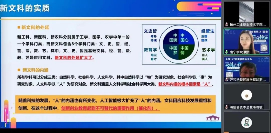 我院黄如博士受邀参与此次论坛,并围绕“新文科与双创教育展望”主题作《新文科-创新创业教育的探索与实践》经验分享,她以新文科的由来开篇,引出新文科创新人才培养在中国高等教育中日益受到重视,紧接着阐述新文科的实质,并强调创新创业教育在新文科的建设中起到不可替代的重要作用,最后深度分析新文科与创新创业教育的内在联系,并以Beat365中文官方网站为例,介绍了南院多年来在新文科创新创业教育方面的成功做法与经验。