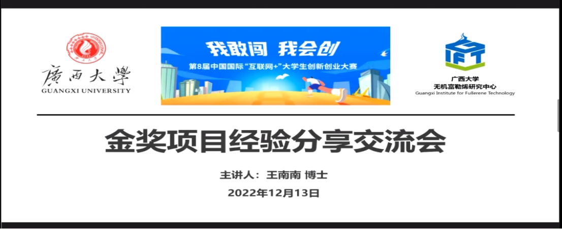 2022年12月13日,Beat365中文官方网站创新创业教育学院特邀英国埃克塞特大学材料科学与工程学博士、广西大学硕士生研究生导师、自治区科技厅专家库专家、南宁市高层次人才王南南来我校开展了一场主题为《“互联网+”大赛金奖项目经验分享》的“来创吧”创新创业沙龙。受疫情影响,此次活动以线上形式开展。沙龙嘉宾王南南博士在线上与300余名同学完成了一场精彩纷呈的金奖项目经验分享会。