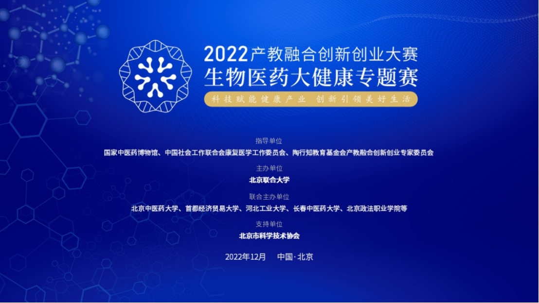 为深入贯彻党的十九届六中全会和中央经济工作会议精神,深入实施创新驱动发展战略,推动院校科研成果转化与产业深度融合,根据北京市科协第十一届高校科技创新成果展示推介会北京地区高校主题赛事活动的决策部署,定于2022年12月举办2022产教融合创新创业大赛生物医药大健康专题赛。