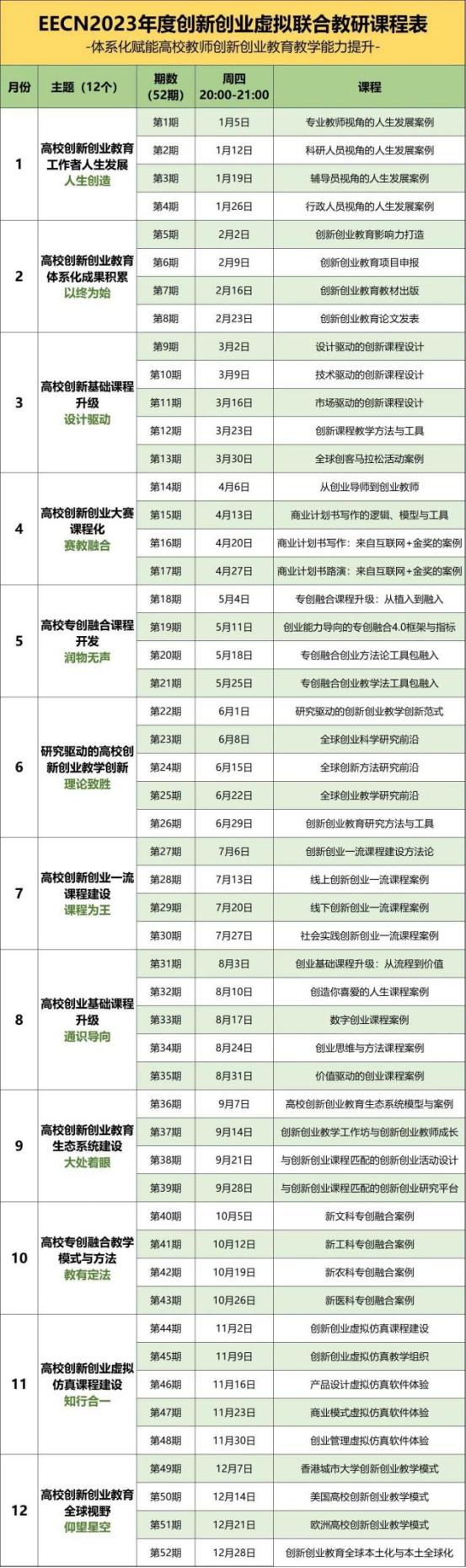 通过体系化、可持续、高质量的创新创业师资培训课程。每月聚焦1个主题,全年含括创新创业教育12大主题;每个主题匹配1名领衔专家,全年52名顶级专家分享;每周1小时线上创业教育直播,全年52期专家课。