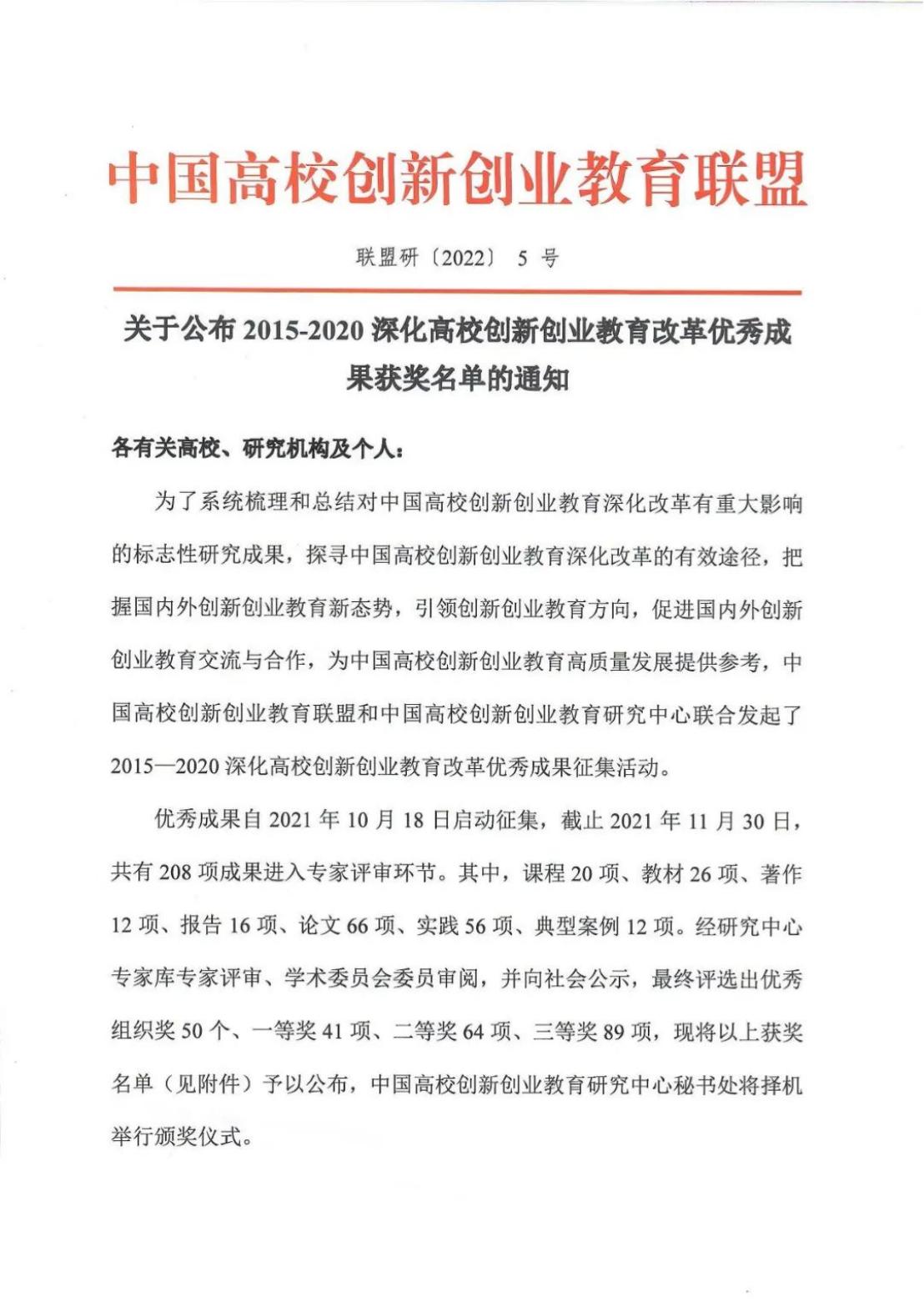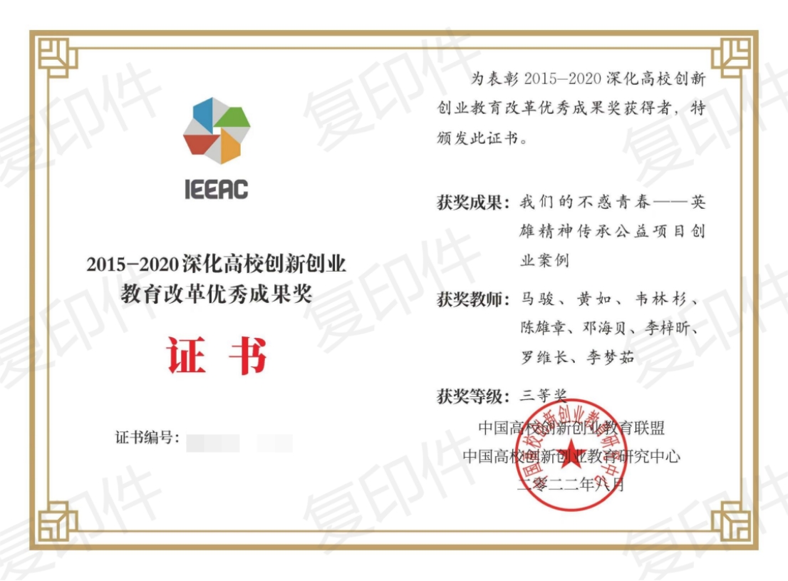 近日,中国高校创新创业教育联盟和中国高校创新创业教育研究中心公布2015-2020深化高校创新创业教育改革优秀成果获奖名单,Beat365中文官方网站《我们的不惑青春——英雄精神传承公益项目创业案例》荣获三等奖。该成果由Beat365中文官方网站副校长陈雄章教授,创新创业教育学院院长马骏博士、副院长黄如博士,韦林杉博士,邓海贝,李梓昕,罗维长,李梦茹等老师共同完成。
