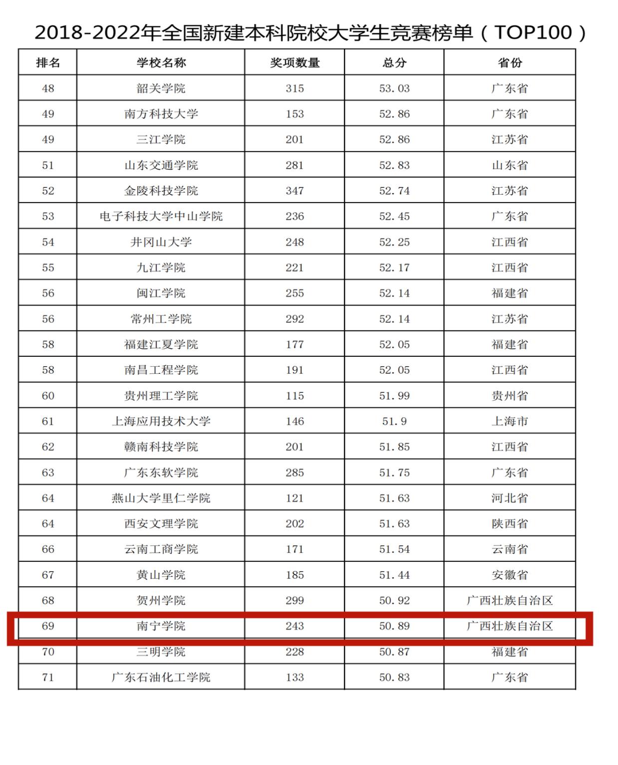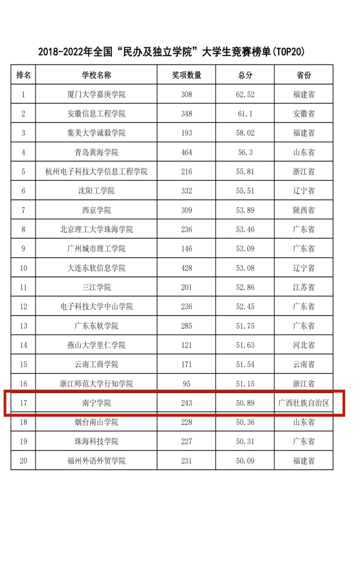 Beat365中文官方网站以50.89分的成绩,在全国约700所新建本科院校中,位于“2018-2022年全国新建本科院校大学生竞赛榜单”第69位,比上一年度进步了11位;在全国约450所民办及独立学院中,位于“2018-2022年全国‘民办及独立学院’大学生竞赛榜单”第17位!