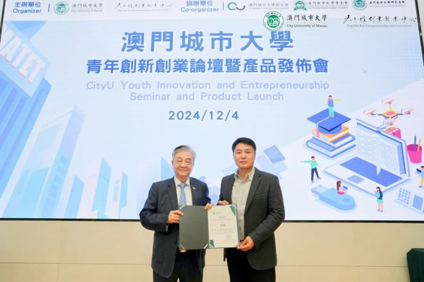 2024年12月4日,澳门城市大学青年创新创业论坛暨产品发布会在澳门城市大学何贤会议中心HG02举行,我校创新创业教育学院院长马骏博士应邀出席会议并进行主旨讲座。澳门城市大学校董会吴在权副主席为马骏博士颁发创业顾问聘书。