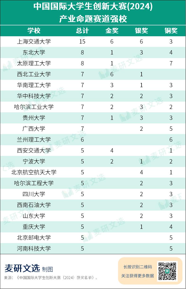 2024年赛事中,产业命题赛道获奖总数居首的依然是上海交通大学(15项),东北大学、太原理工大学均以8个奖项并列第二。