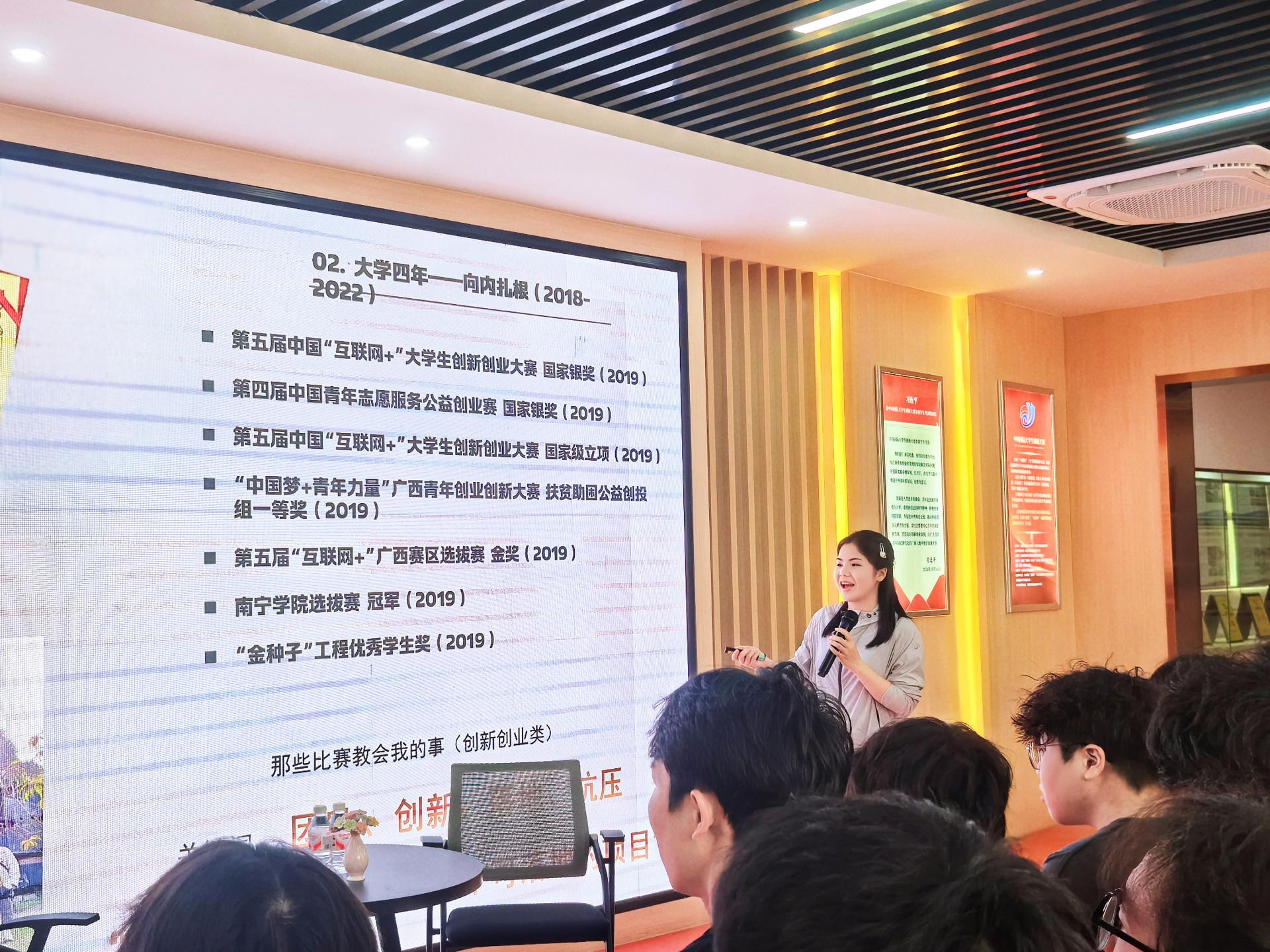 在分享中,陆辰艳在简短自我介绍后,以“向内扎根、向下沉淀、向外绽放”为主线,围绕大学期间参与双创竞赛、团队组建与个人成长、毕业后专业不对口的求职经历等方面与在场的同学们进行深度对话。她坦言,自己的成长并非一帆风顺,但正是比赛、社会实践、职业的磨炼,让她不断积累、不断前行。她鼓励在场同学:“慢一点,也可以上岸;你的专业,不只是找工作的工具;走过的弯路,都是你地图的一部分。”
