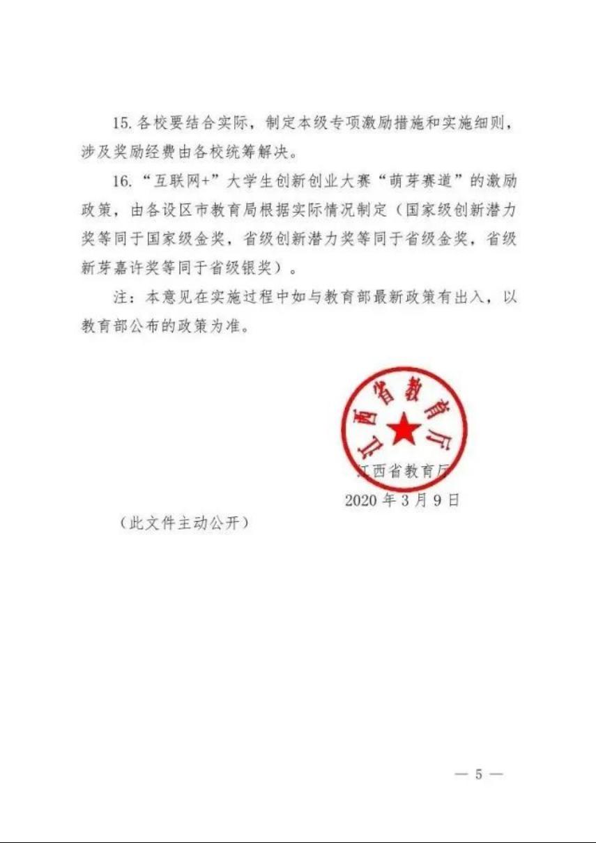 (七)萌芽赛道按照“国赛创新潜力奖等同于国赛金奖,省级创新潜力奖等同于省级金奖,省级创新鼓励奖等同于省级银奖,省级创新入围奖等同于省级铜奖”的原则进行激励。萌芽赛道省级创新潜力奖及以上等级获奖项目,指导老师(教师排位前三)认定为承担一节省级公开课;省级创新鼓励奖及创新入围奖项目,其指导老师(教师排位前三)认定为承担一节市级公开课。