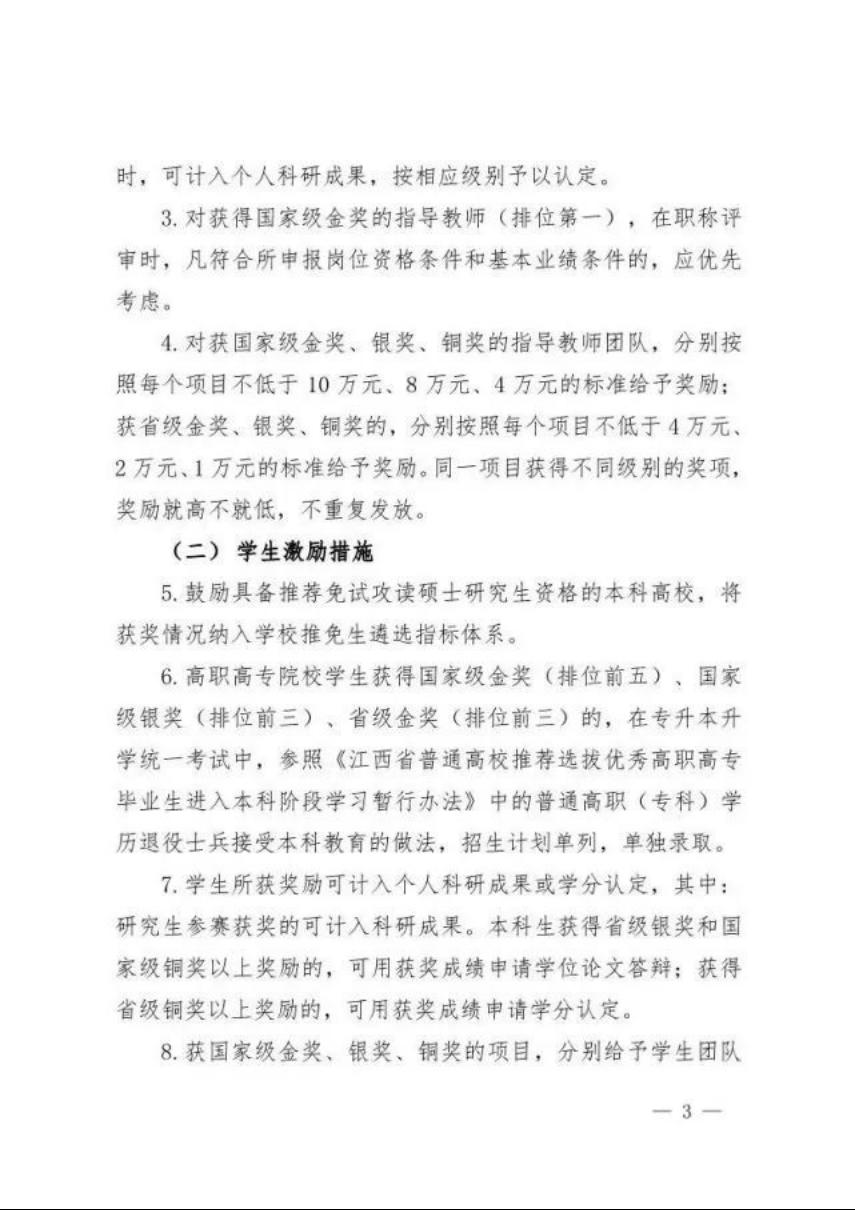 (五)支持学校对国赛、省赛获奖项目指导教师在工作量认定、年度考核、职称评审、评优评先等方面给予倾斜,国赛金奖项目排位前二的指导教师在同等条件下应优先考虑。学校应对国赛、省赛获奖项目指导老师,按获奖等级计算相应的教学或科研工作量。鼓励学校将国赛金奖、银奖分别参照省级教学成果特等奖、一等奖同等对待。