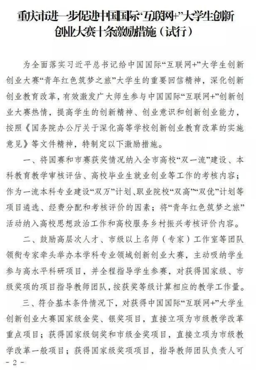 关于印发《重庆市进一步促进中国国际“互联网+”大学生创新创业大赛十条激励措施(试行)》的通知
