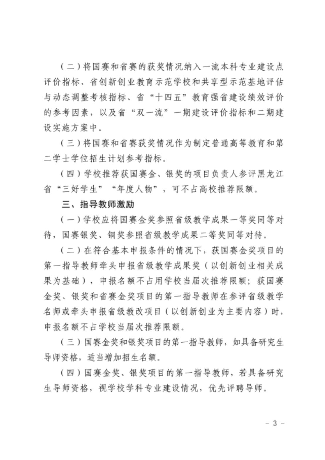 将省/国赛获奖情况纳入黑龙江省高水平大学与优势特色学科建设和“双特”“双高”“双优”计划绩效评估;给与国家级金奖项目不少于10万,银奖不少于5万,铜奖不少于2万元的奖励;研究生参赛获奖应计入科研成果及学位考核范围,本科生获省赛金奖及以上,可用获奖成绩申请学位论文答辩,省铜及以上奖励可用获奖成绩申请学分认定。
