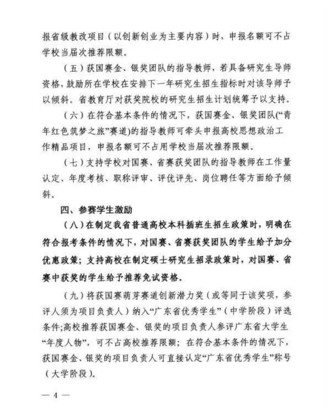 (六)对具备研究生导师资格的国赛金奖、银奖项目指导教师,鼓励学校在安排下一年度研究生招生指标时予以倾斜。