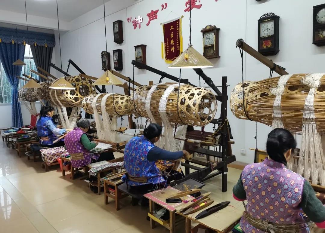 在一楼的纺织机和二楼纺织工坊中,纺织工人在演示壮锦纺织的过程,五彩的细线在他们手中不断穿梭,描绘着栩栩如生的画面。在三楼展厅中,陈列着许多精美的装饰产品,它们在原有造型中加入了壮锦元素,将现代美学设计融入传统技艺中,体现了匠人们不断探索的创新精神。