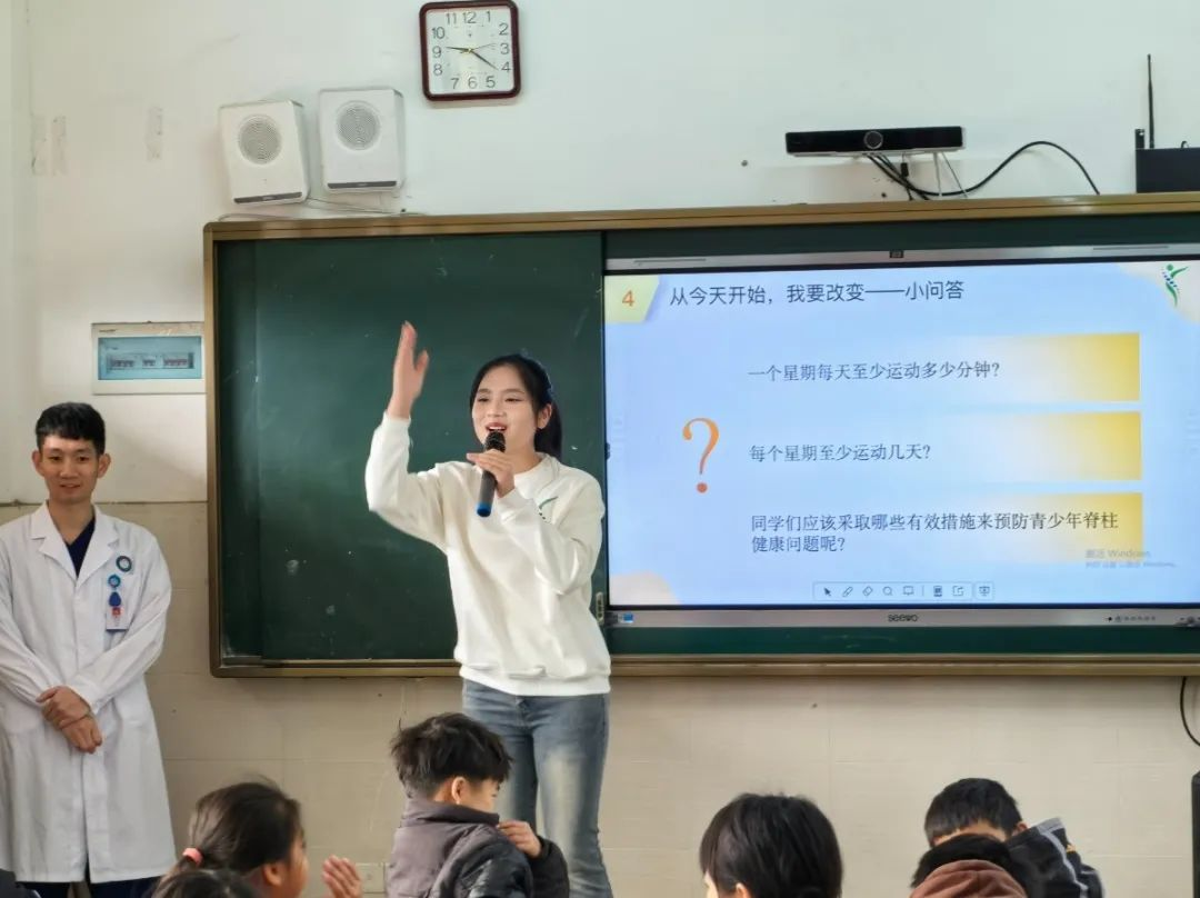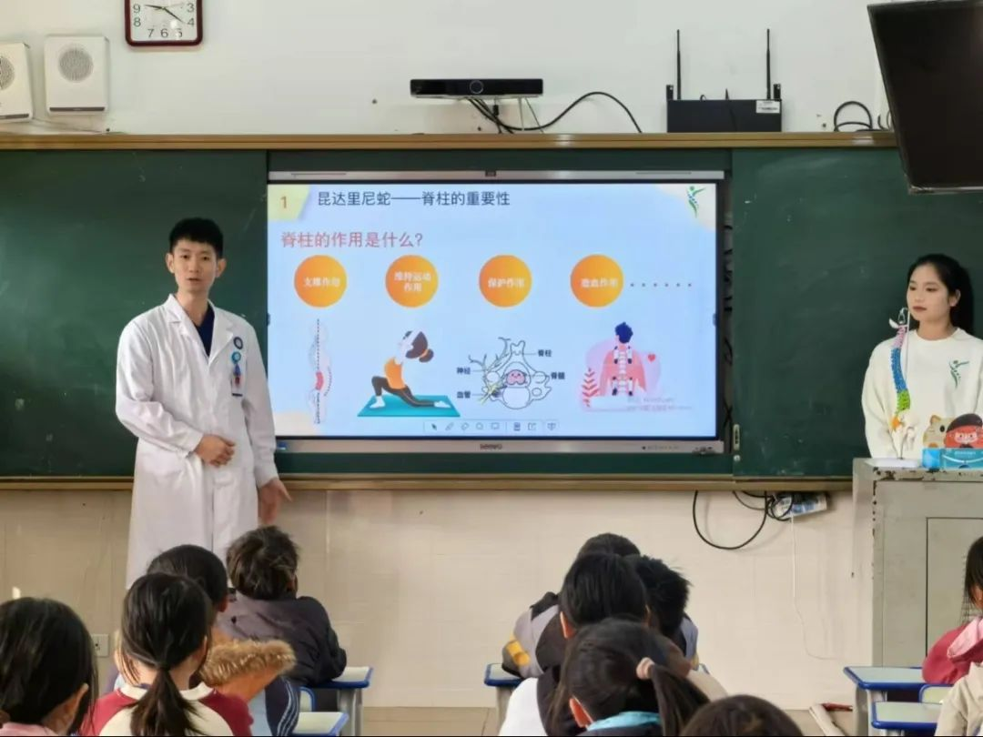 “蛇年就要到了,小朋友知道什么是昆达里尼蛇吗?”“脊柱侧弯是什么?”“怎么预防脊柱侧弯呢?”公益宣讲团通过问题引入,勾起小学生的好奇心和求知欲,通过情境式的故事情节设置和自主卡通IP“小明”进行宣讲,小学生们积极性高涨,与宣讲员互动频繁,现场气氛热烈。通过宣讲,小学生们认识到脊柱侧弯的危害,掌握了脊柱侧弯防控的基础知识,培养起自觉维护脊柱健康的意识。宣讲队员还现场示范教学,让小学生学会了团队自创的脊柱健康操。