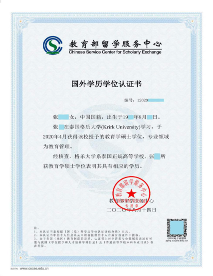 国(境)外学历学位认证书(示例)