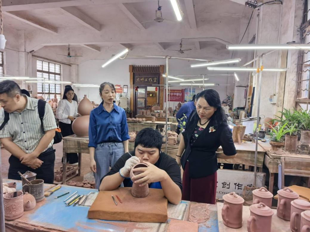 5月26日下午,调研组参加在钦州市人力资源和社会保障局开展的校地合作调研座谈。钦州市人社局副局长陈建统、人才服务中心主任周丹等出席会议,陈建统副局长介绍,钦州市依托西部陆海新通道战略,重点发展临港产业、数字经济及特色文化旅游产业,亟需与高校建立长效合作机制,推动人才与产业精准对接。座谈结束后,调研组赴坭兴陶艺术馆及柑浦堂浦北旗舰店开展实地调研。
