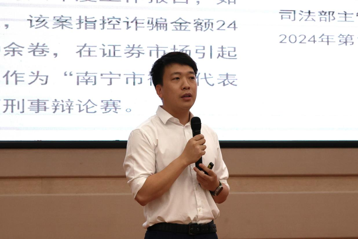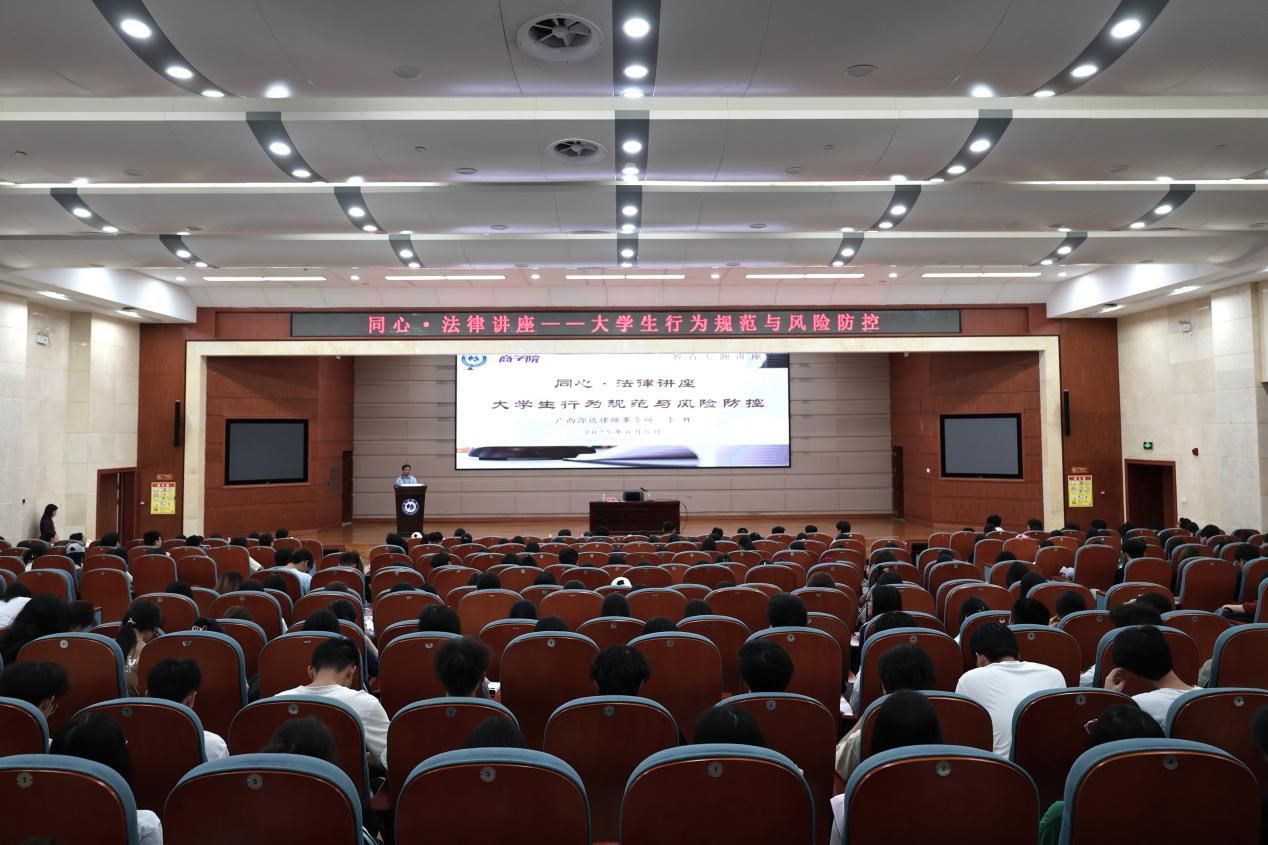 为切实增强学生法律意识,筑牢校园安全防线,6月6日下午,商学院与民革广西区委会联合举办“同心·法律讲座——大学生行为规范与风险防控”主题讲座在图书馆报告厅举行,特邀广西沵达律师事务所执行主任、合伙人李辉律师担任主讲。本次讲座由商学院党委书记蒙永亨主持,学院22级、23级及24级共550余名学生齐聚一堂,共同聆听这场关乎青春航向的法律必修课。