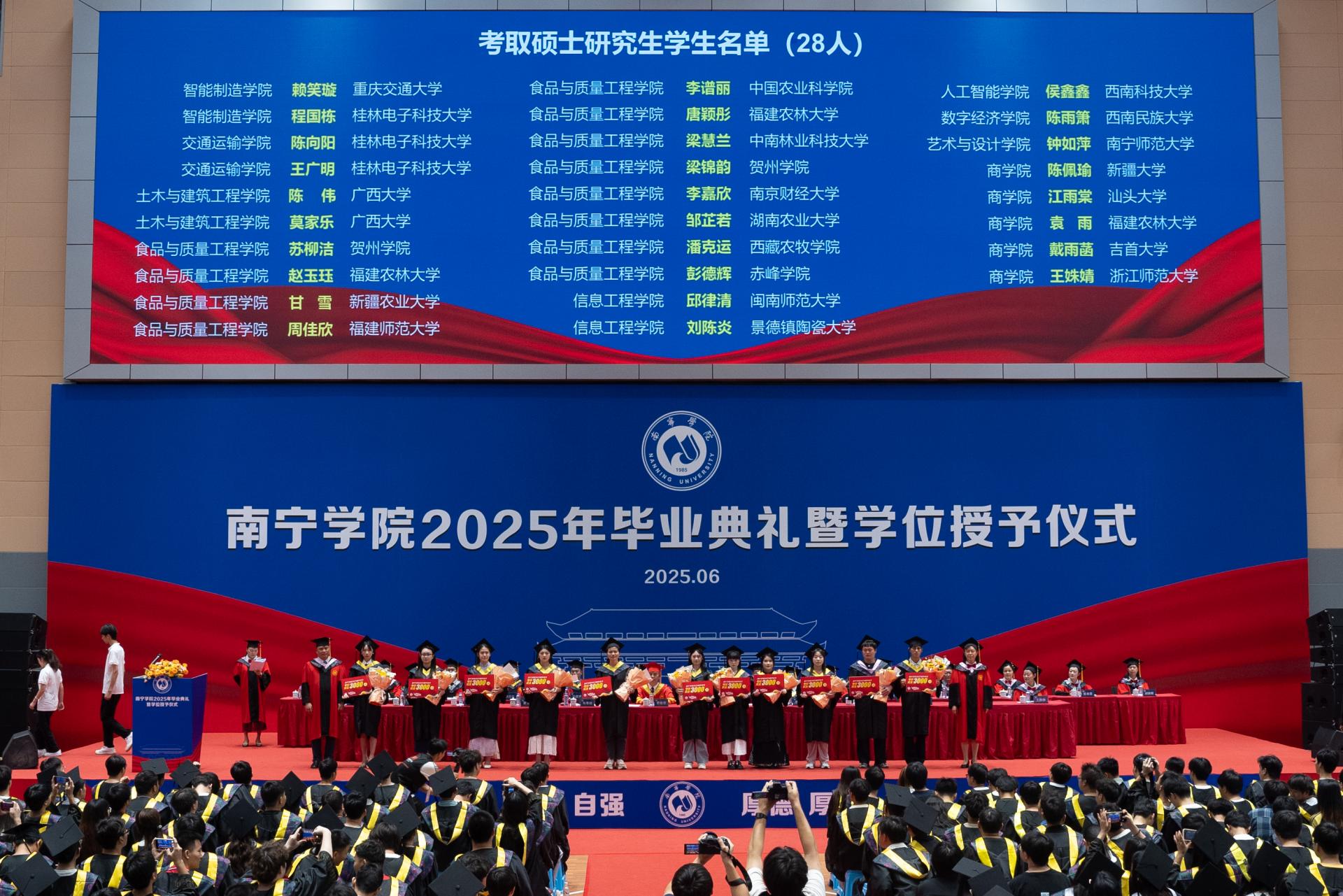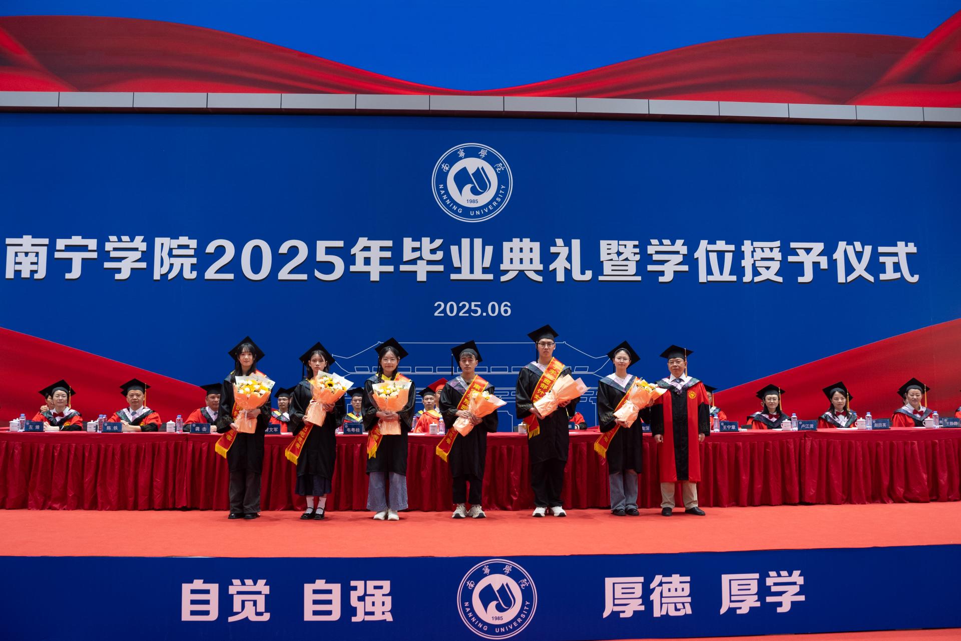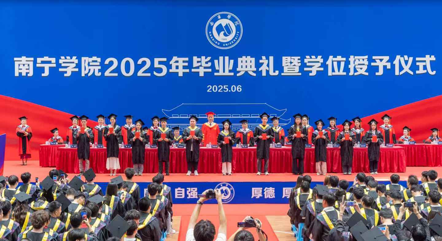 在热烈的氛围中,主席台前排领导为毕业生代表颁发毕业证书,并为自治区优秀毕业生颁发荣誉证书。这些优秀毕业生在校期间学习成绩优异,思想品德、科研创新、社会实践等方面表现突出,充分展现了南院学子的精神风貌。这份表彰既是对获奖同学个人努力的肯定,也是学校人才培养成果的集中体现。他们是全体同学学习的榜样,激励更多南院学子追求卓越、奋发向上。