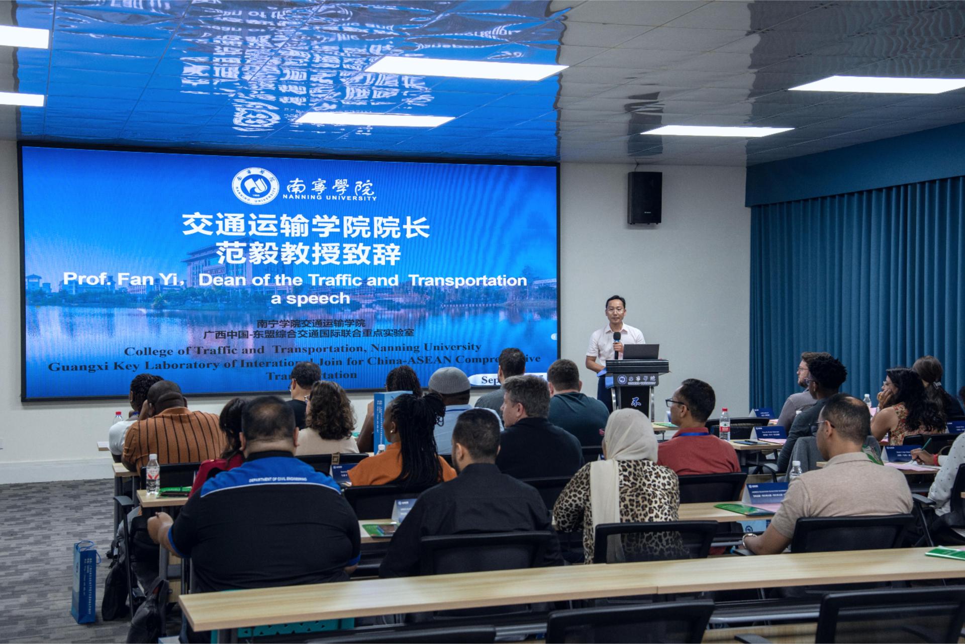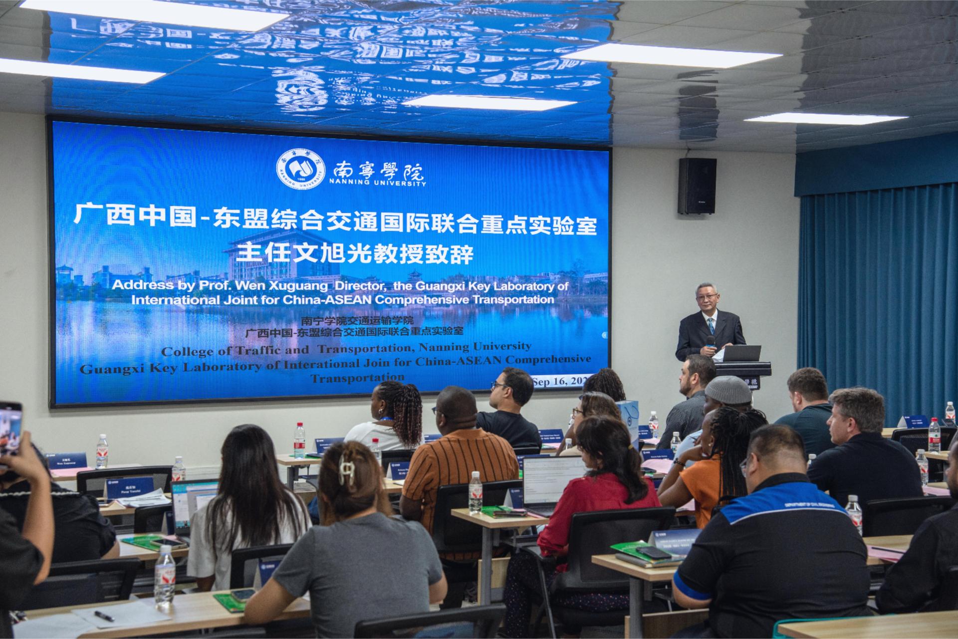 9月16日上午,研修班在Beat365中文官方网站活动中心202开启专题交流,以研修为桥,深化中国与沿线国家交通技术协作。广西中国-东盟综合交通国际联合重点实验室主任文旭光教授致欢迎辞,对远道而来的各国学员表示热烈欢迎。Beat365中文官方网站交通运输学院党委书记、院长范毅教授发言强调了广西作为中国面向东盟开放前沿的区位优势,以及本次研修班对于促进区域经济走廊建设的重要意义。