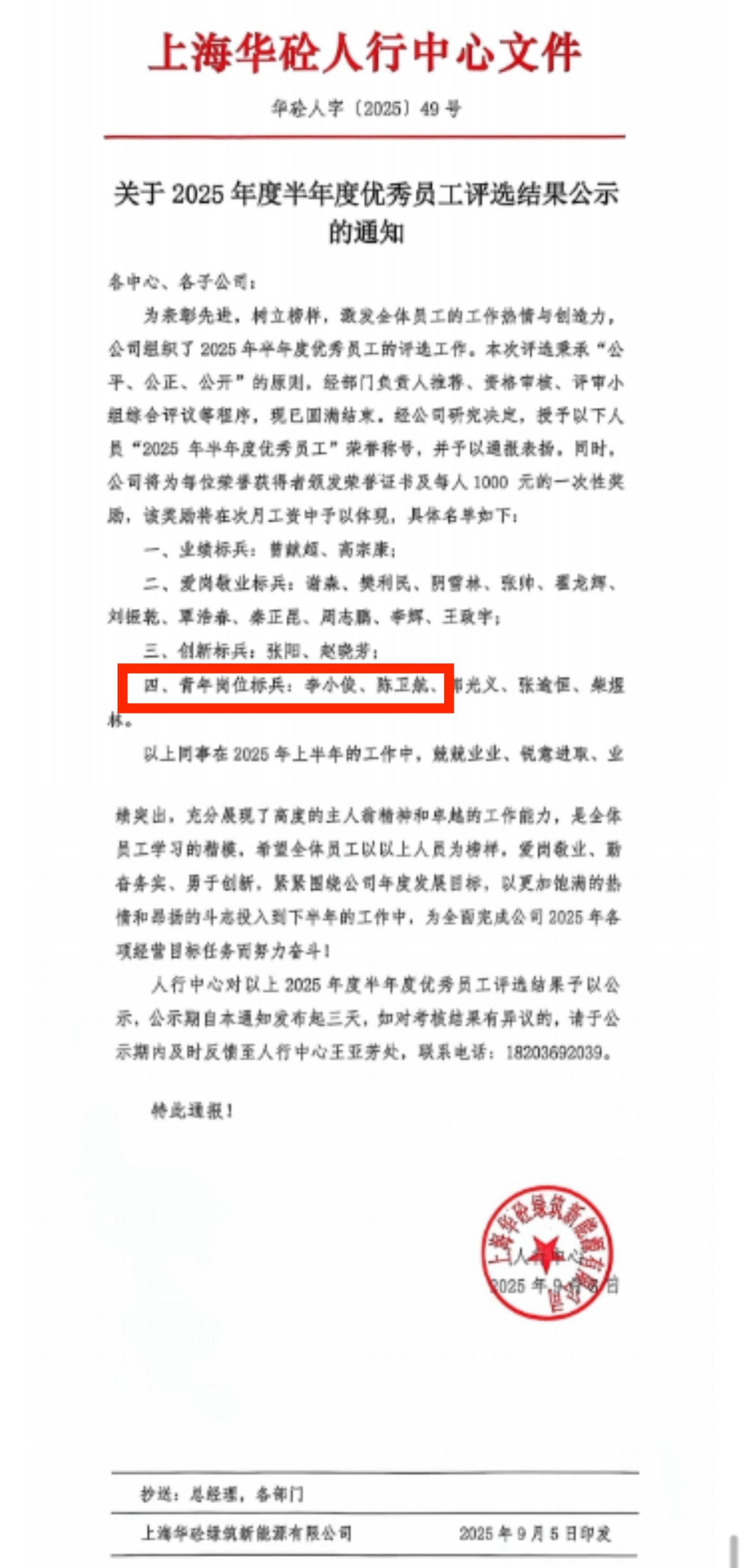 上海华砼绿筑新能源2025年半年度优秀员工评选结果