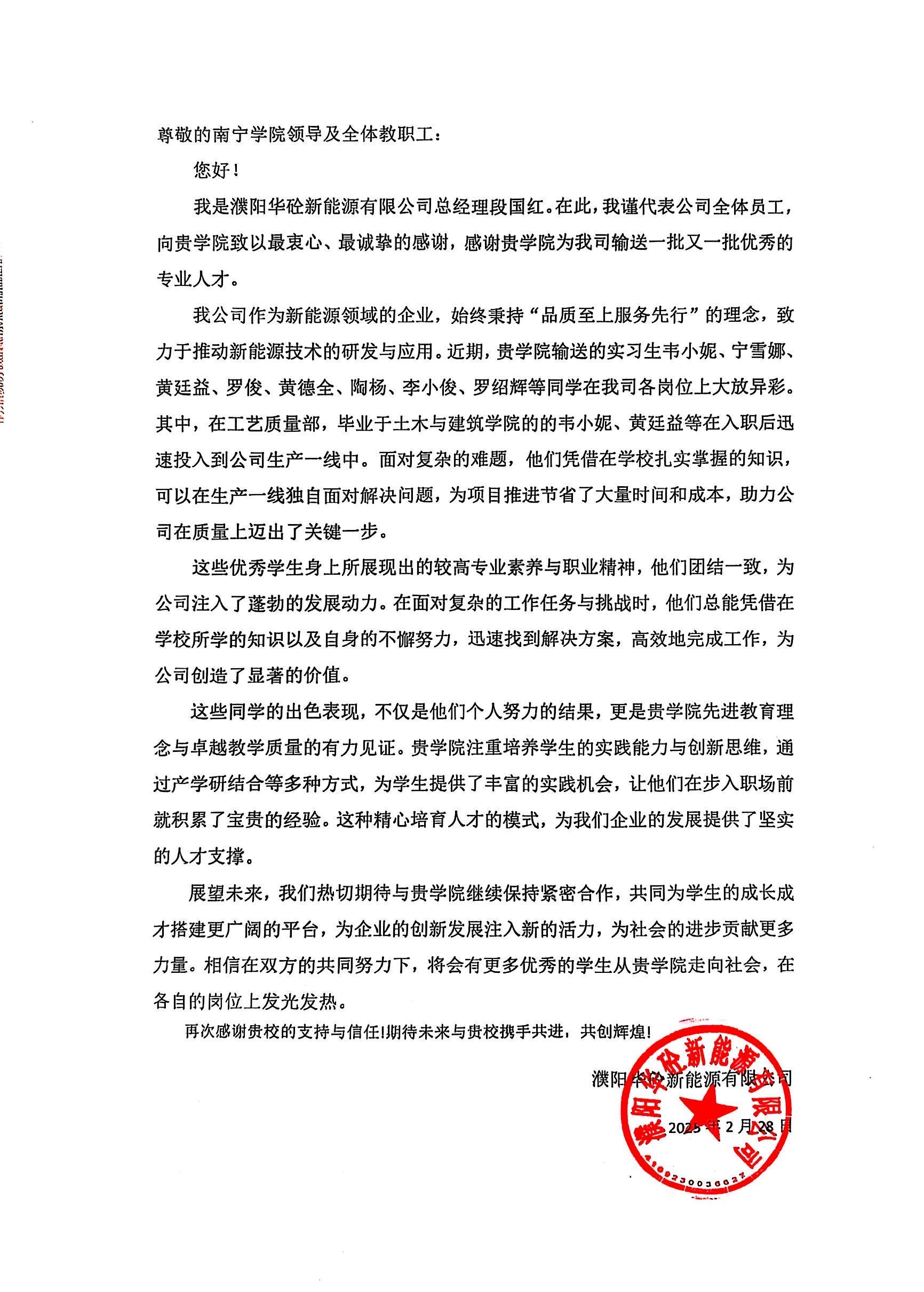 早在2025年2月,土木与建筑工程学院已收获来自广西和濮阳华砼新能源有限公司两个基地发来的感谢信,对“定向班”就业育人路径和服务地方区域经济发展能力给予了充分肯定。近期这份来自上海华砼绿筑新能源有限公司的通报表扬更是体现了对土木与建筑工程学院“定向班”扎实育人成果的高度认可。在“定向班”精准就业育人模式下,更多行业新星也持续涌现:上海华砼绿筑新能源有限公司的李小俊、陈卫航(第一期优秀学员)获公司“2025半年度优秀员工”、“青年岗位标兵”称号;上海电气研砼(木垒)建筑科技有限公司韦程程(第三期优秀学员)获《当代广西》“夯实高校毕业生就业压舱石”专题报道。此外,上海华砼绿筑新能源有限公司与定向班50名同学实习期满后签订了正式劳动合同,上海电气研砼(木垒)建筑科技有限公司与定向班18名同学实习期满后签订了正式劳动合同,江苏双为新能源科技有限公司与定向班11名同学实习期满后签订了正式劳动合同。这些同学成功实现了从“在校生”到“职业人”的身份转变,让“定向育人”真正落地为“高质量就业”。
