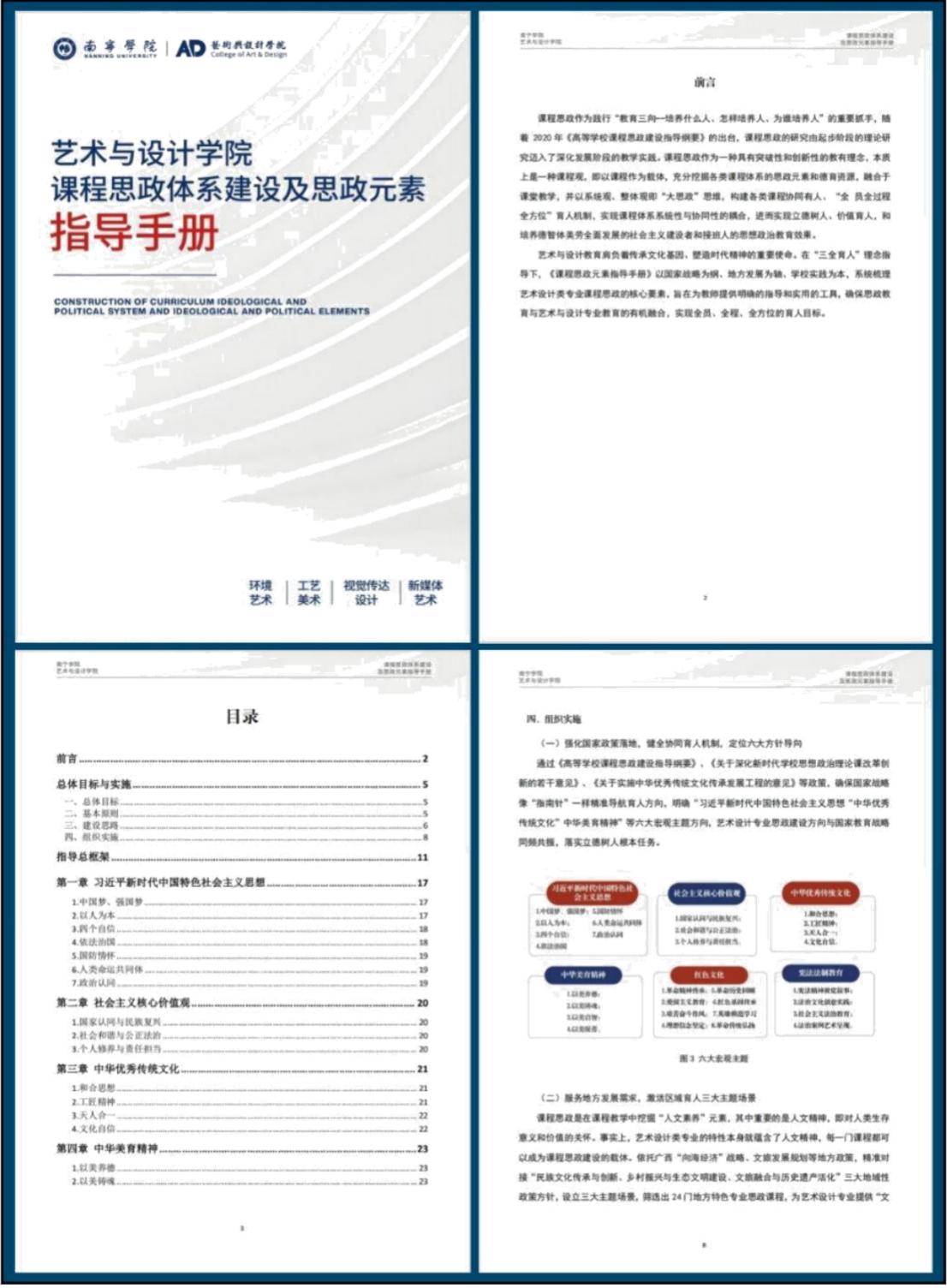 实现课程思政全覆盖:编写《艺术与设计学院思政建设体系建设指南书》(图4),以“壮美广西课程思政深度融入专业教育为核心”将文化传承、家国情怀等思政要素系统嵌入教学标准,制订中华优秀传统文化等6大课程思政方针,重点建设“民族文化、乡村振兴、文旅融合”3大主题方向、建立38个教学专题的在地性课程思政资源库,构建起理论与实践相结合、显性教育与隐性教育相统一的思政育人体系。