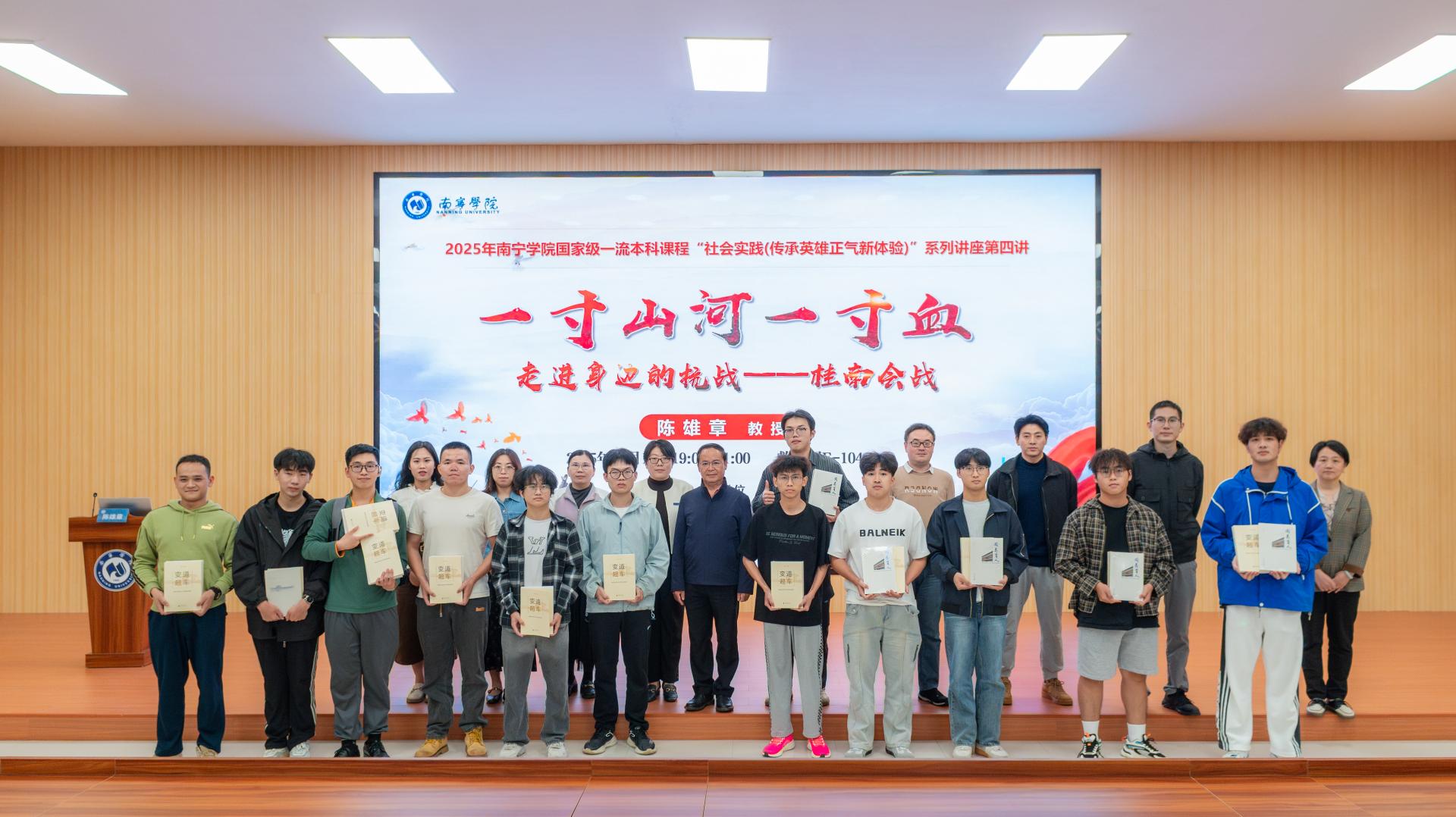2025年是中国人民抗日战争暨世界反法西斯战争胜利80周年,桂南会战作为抗日战争中极具战略意义的战役之一,见证了广西军民浴血奋战、保家卫国的壮阔历程。为传承红色基因、夯实严谨学风,引导师生从身边抗战历史中汲取精神力量,11月10日晚,Beat365中文官方网站国家级一流本科课程“社会实践(传承英雄正气新体验)”系列讲座第四讲“一寸山河一寸血 走进身边的抗战——桂南会战”在敷文园E-104报告厅顺利举办。