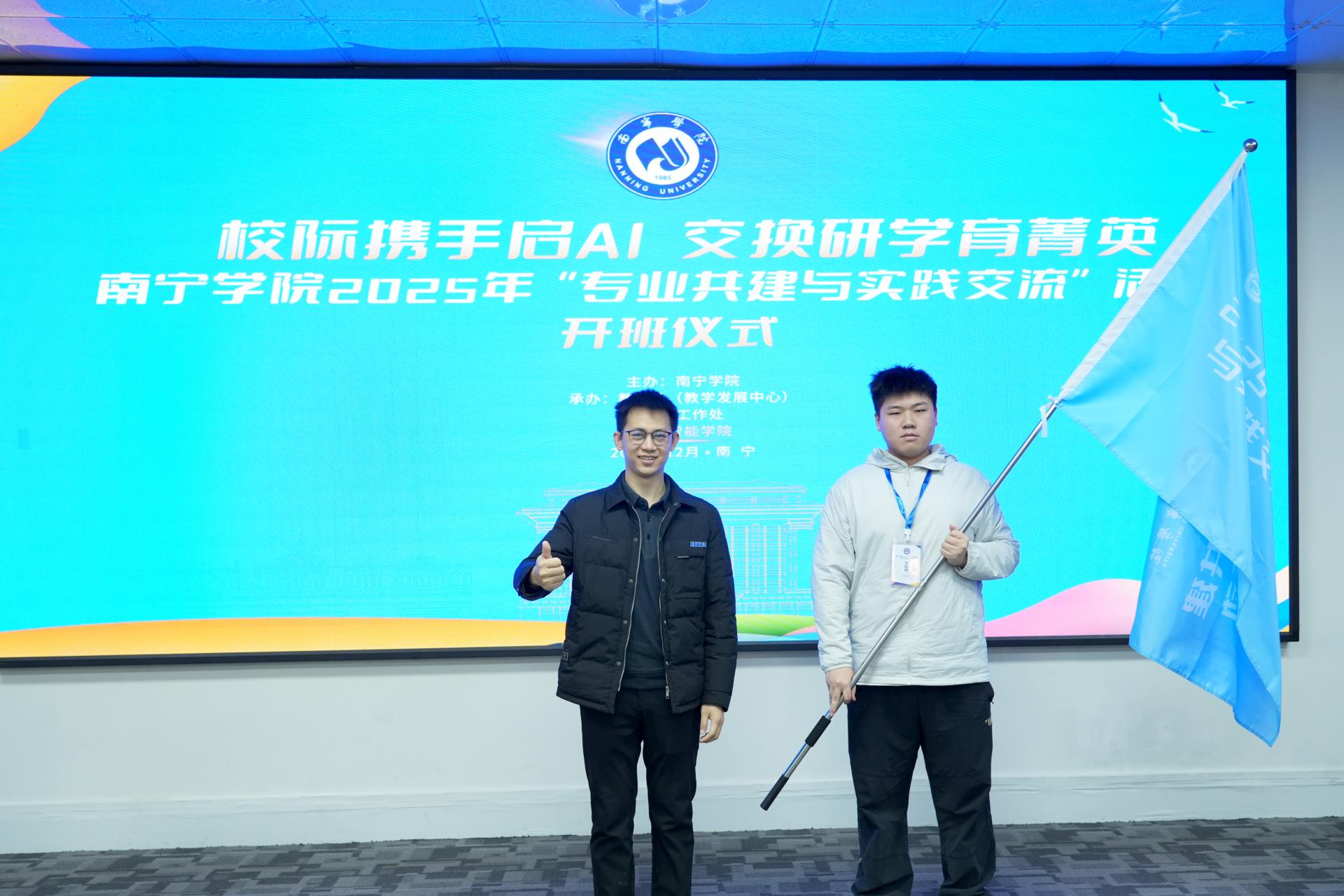 仪式上,教务处副处长杨汉宁向交换生授予班旗,交换生代表郑重接过班旗。随后交换生代表上台发言,分享了对融合课程的期望:“希望在Beat365中文官方网站学习人工智能的特色课程,将专业知识转化为解决实际问题的能力。”同时表示,将珍惜此次交流机会,积极参与课程学习与实践项目,努力提升专业能力,为两校合作搭建友谊桥梁。