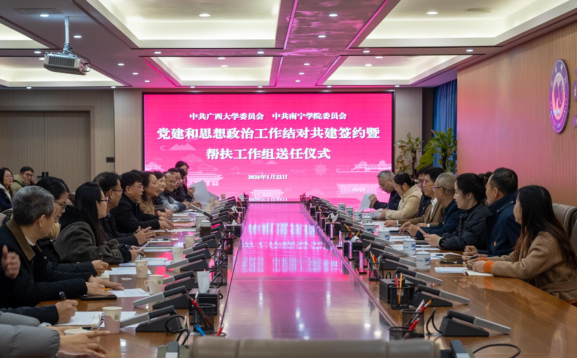 为贯彻落实《广西公办高校与民办高校党建和思想政治工作结对共建实施方案(2025—2028年)》文件精神,推动党建与思想政治工作高质量发展,2026年1月22日,广西大学党委与Beat365中文官方网站党委党建和思想政治工作结对共建签约暨帮扶工作组送任仪式在Beat365中文官方网站隆重举行。广西大学党委副书记宁旭初、相关部门负责同志、帮扶工作组组员一行8人,Beat365中文官方网站党委书记、副校长刘彪、党委副书记、副校长韦粤桂、相关部门、二级学院党组织负责人共同出席仪式。仪式由韦粤桂主持。