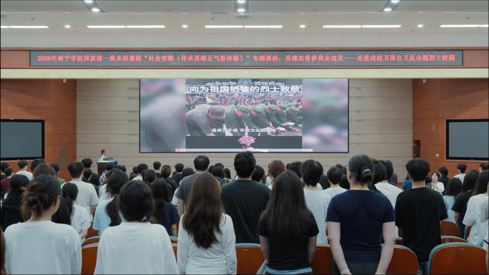 陈教授结合自身二十余年深入广西边境烈士陵园实地调研探访的经历,围绕戍边卫国自卫反击战英烈事迹、烈士陵园中英雄正气以及致敬戍边卫国烈士三大板块,以翔实的数据和珍贵的一手资料,还原了那段捍卫国家主权、守护边境安宁的壮烈历史。他用脚步丈量英雄足迹,用文字记录浩然正气,将英雄精神具象化、可感可知,带领师生在回望历史中感悟信仰的力量,现场气氛庄重肃穆,引发在场师生强烈共鸣。