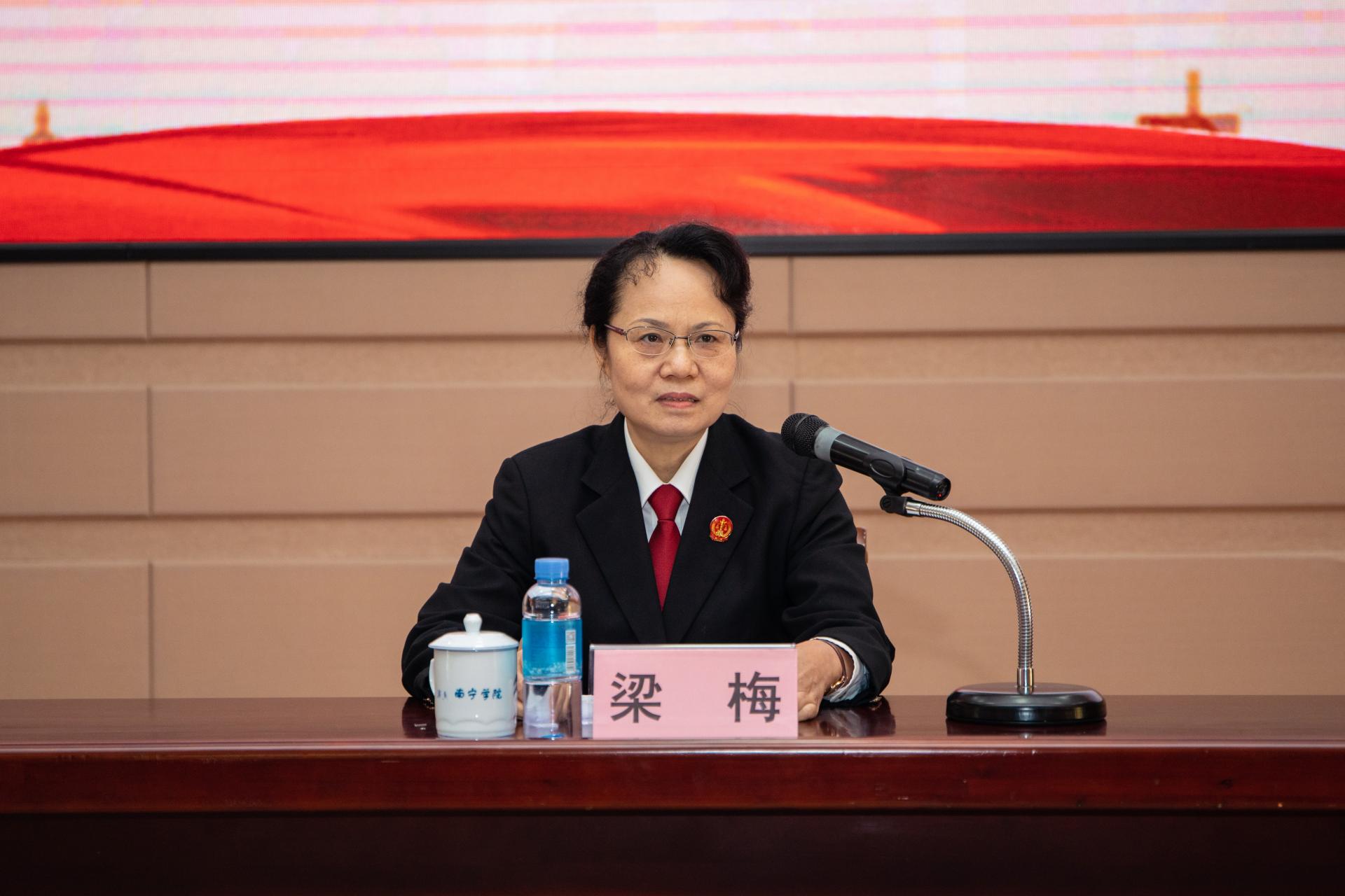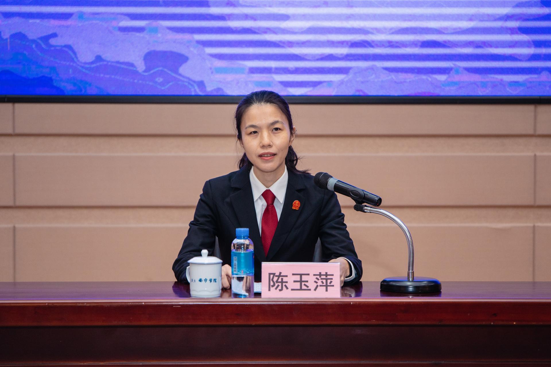 自治区高级人民法院刑二庭庭长张晓伶、刑三庭副庭长吴莹、民一庭副庭长张英伦,南宁市青秀区人民法院党组成员、副院长陈玉萍4位法官分别作《提高国家安全意识,增强国家安全责任》《勇肩重任守法纪,志存高远爱祖国》《提升法治意识与法治素养,成就更好的自己》《从法科生到法院人》主题发言。