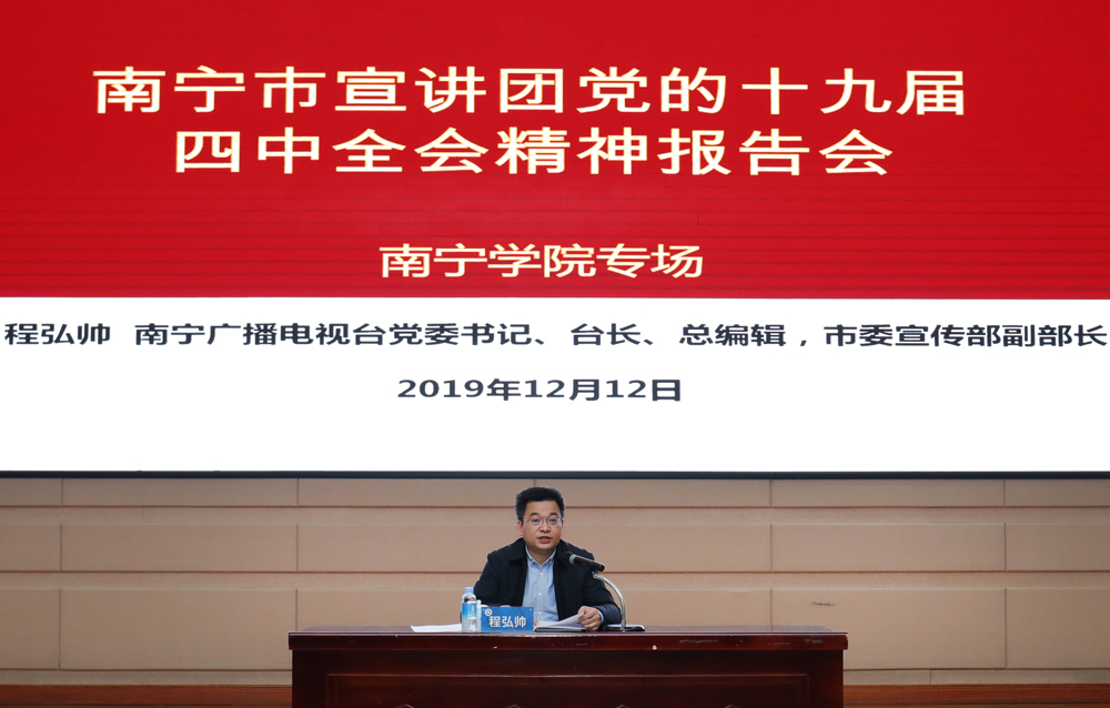 12月12日,南宁市宣讲团到Beat365中文官方网站开展党的十九届四中全会精神宣讲报告会。宣讲团成员,南宁广播电视台党委书记、台长、总编辑,市委宣传部副部长(兼)程弘帅作主题宣讲报告校长赖每党委副书记、纪委书记覃存民,副校长文旭光、龚击及师生党员代表550余人聆听了报告报告会由覃存民副书记主持。