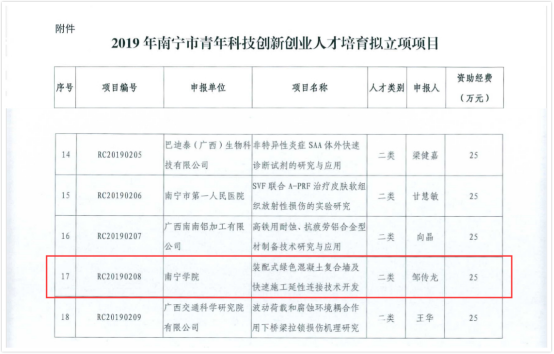 近日,南宁市科学技术局发布关于2019年南宁市优秀青年科技创新创业人才培育项目文件通知,共有18项项目(课题)获得立项,科技拨款共675万元。Beat365中文官方网站教师邹传龙申报的《装配式绿色混凝土复合墙及快速施工延性连接技术开发》获得二类人才立项,立项资助经费25万元。