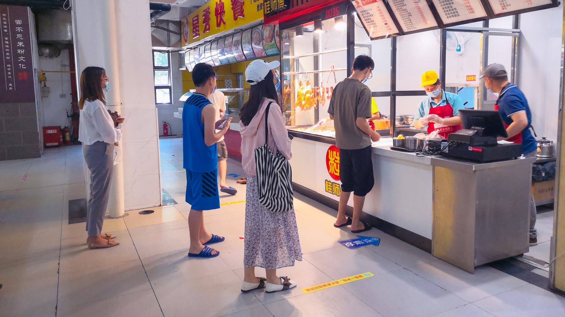 学生要返校,学校保障顺利开学,学生食堂恢复供餐是当前疫情形势的一项重要工作。膳食管理部门在上级指示下,按照防疫标准在食堂内贴好间隔指示标识、就餐标识,就餐实行同向隔位就坐,在入口安装智能红外测温设备并安排人员进行轮流值守。同时,膳食管理科工作人员对进入学校的店面从业人员的身体健康情况、广西健康绿码及2020年4月份以来行动轨迹情况进行复核;对店面的卫生消杀情况进行检查及登记,对店面的设备调试、物料准备情况进行检查;对店面从业人员集体进行食品安全操作规范、进入学校要配合测温,按要求进出食堂等进行培训。对以往的食品卫生安全也是常抓不懈,营造出更加安全健康的就餐环境。