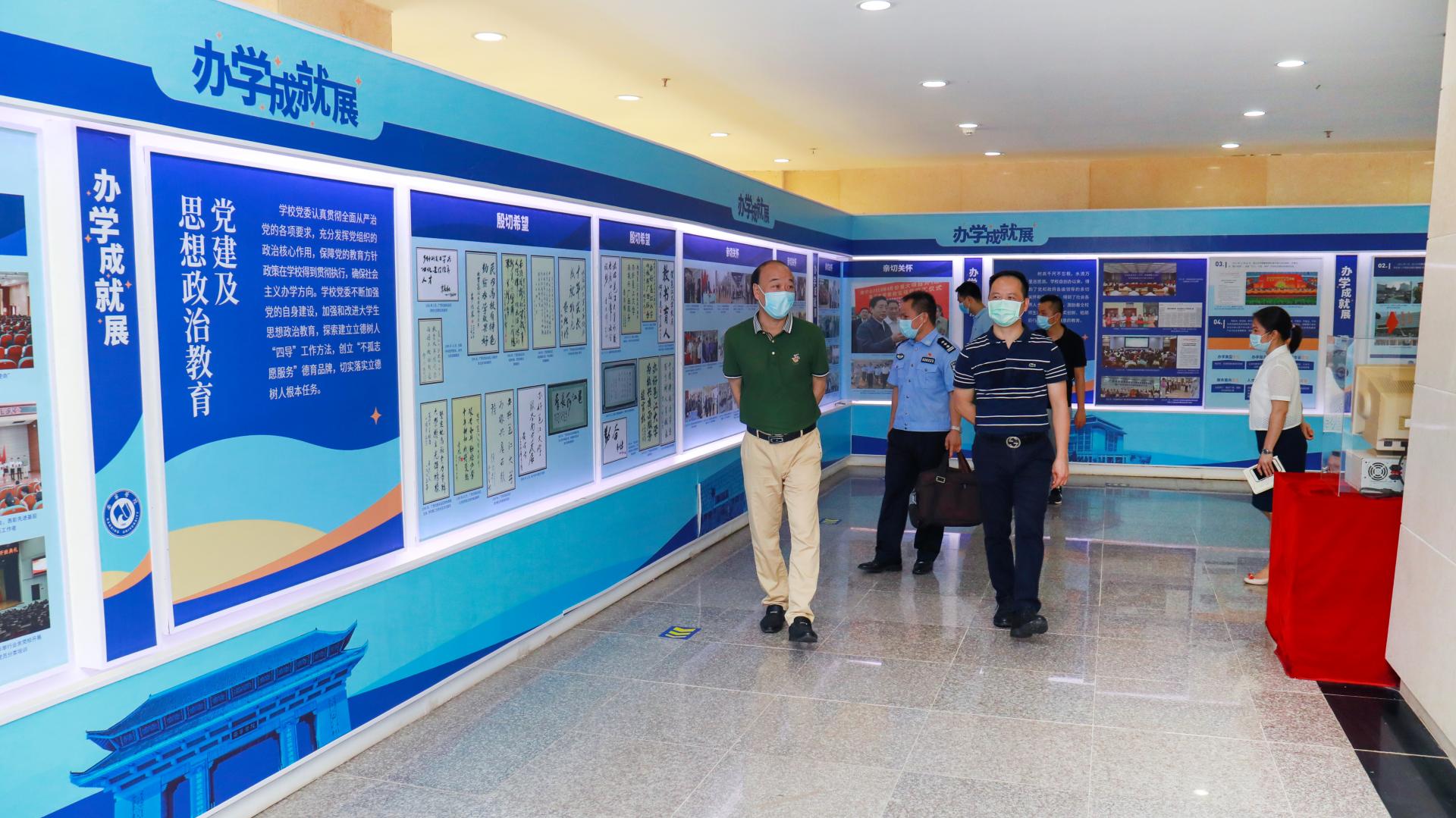 谢元才一行首先参观考察了学校的宣传广告栏、“小晒”同学及学校办学成就展,实地了解校园文化建设及宣传氛围营造情况。在图书馆办学成就展厅内,陈铁部长向来宾详细介绍了学校办学规模、配套设施、发展历程等基本办学概要,并为来宾讲解了学校办学成就展的建设思路及校史档案资料的收集途径。