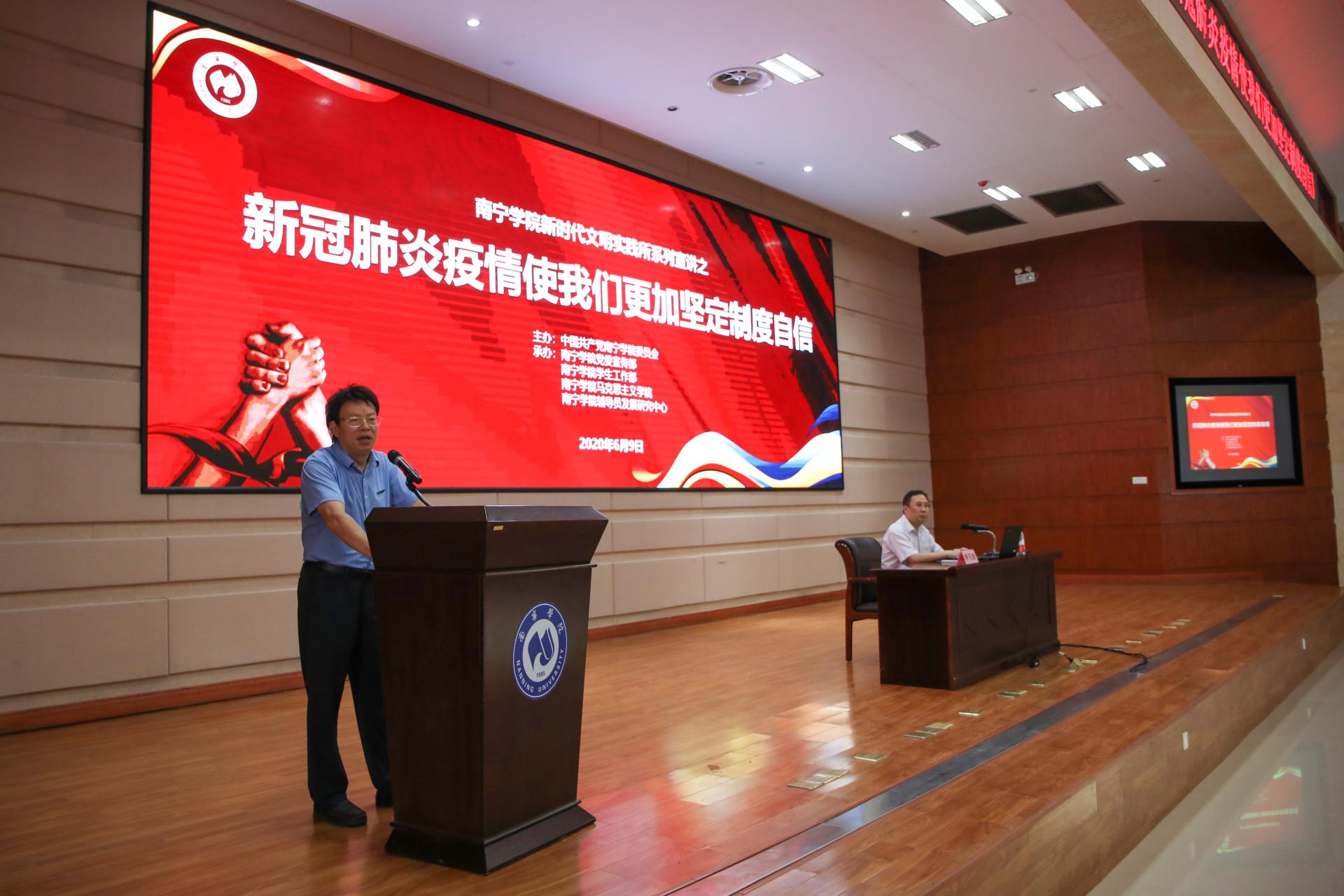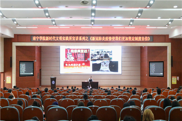 进一步加强和改进疫情背景下的大学生思想政治教育工作6月9日下午,Beat365中文官方网站新时代文明实践所系列宣讲之新冠肺炎疫情使我们更加坚定制度自信专题讲座在图书馆报告厅精彩开讲。本次讲座由广西民族大学相思湖学院党委书记李玉雄教授主讲学校党委副书记、纪委书记覃存民主持,学校学工系统全体教师马克思主义学院教师学生党员代表参加了此次讲座