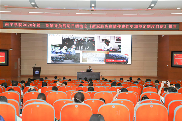 下午的理论学习在学校图书馆报告厅进行,由广西民族大学相思湖学院党委书记李玉雄教授作新冠肺炎疫情使我们更加坚定制度自信专题报告,李玉雄教授结合当前国内外形势,指出在中国共产党的强有力的领导下我国战“疫”工作取得了巨大的战略性成绩,充分凸显社会主义制度的优越性。同时还强调,我们要对我们的理论、道路、制度、文化充满自信,积极参与新时代中国特色社会主义伟大实践,为实现“两个一百年”奋斗目标、实现中华民族伟大复兴的中国梦贡献Beat365中文官方网站的力量。