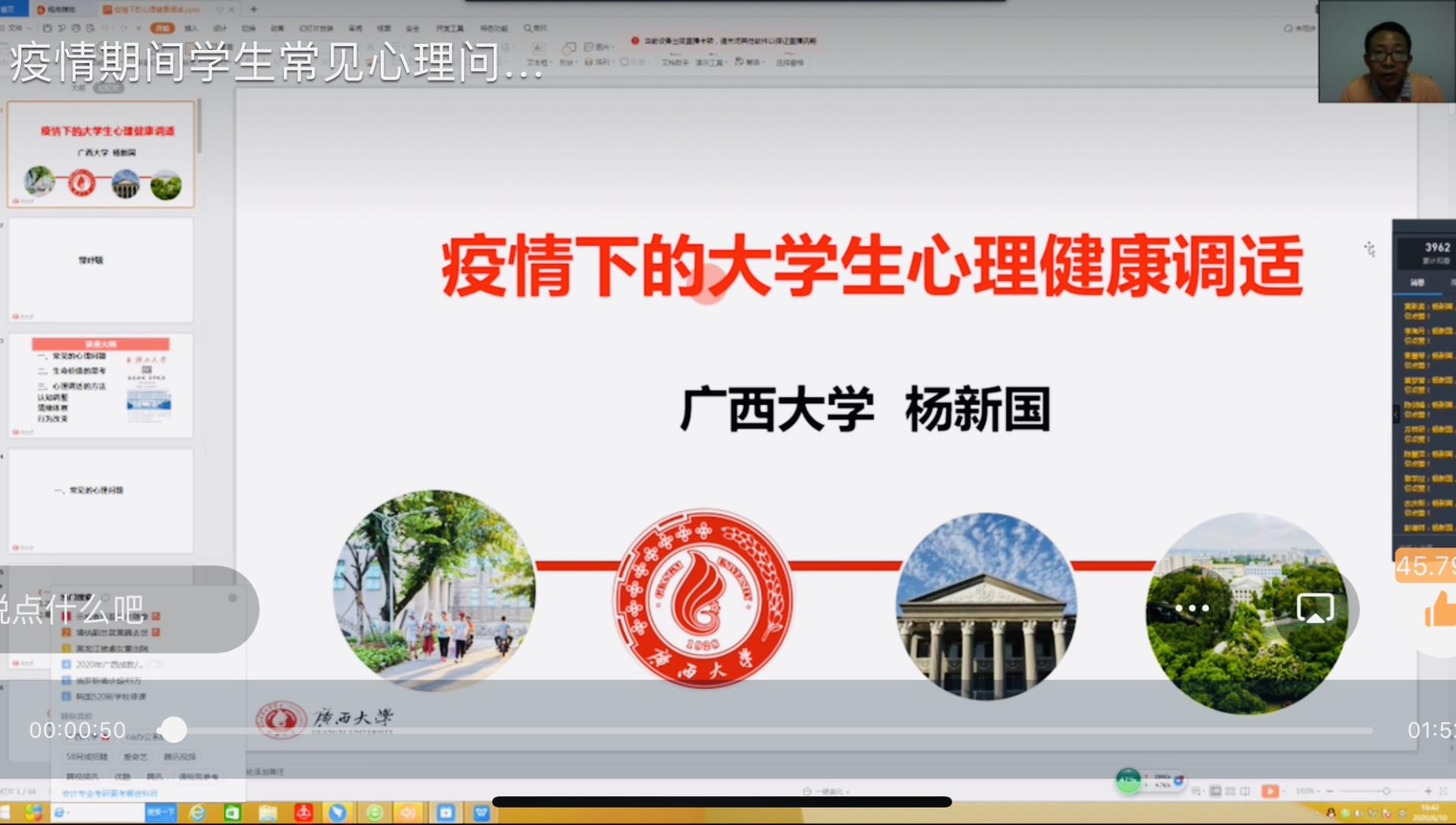 为进一步提高校学生的心理素质,促进学生的身心健康发展,帮助学生在疫情期间更好地调适心理状态,6月10日晚,校大学生心理健康教育与咨询中心邀请了广西大学心理健康所所长、心理健康教育与咨询中心副主任杨新国教授通过线上直播的方式,举办“疫情期间学生常见心理问题及调适”专题辅导培训。