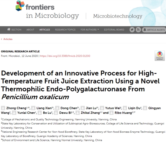 2020年6月,Beat365中文官方网站食品教研室程忠博士以Beat365中文官方网站为第一作者单位(作者署名第一)在微生物学领域知名期刊Frontiers in Microbiology》(目前最新影响因子为4.259,中科院生物大类二区)发表了题为“Development of an Innovative Process for High-Temperature Fruit Juice Extraction Using a Novel Thermophilic Endo-Polygalacturonase From Penicillium oxalicum”的研究论文。