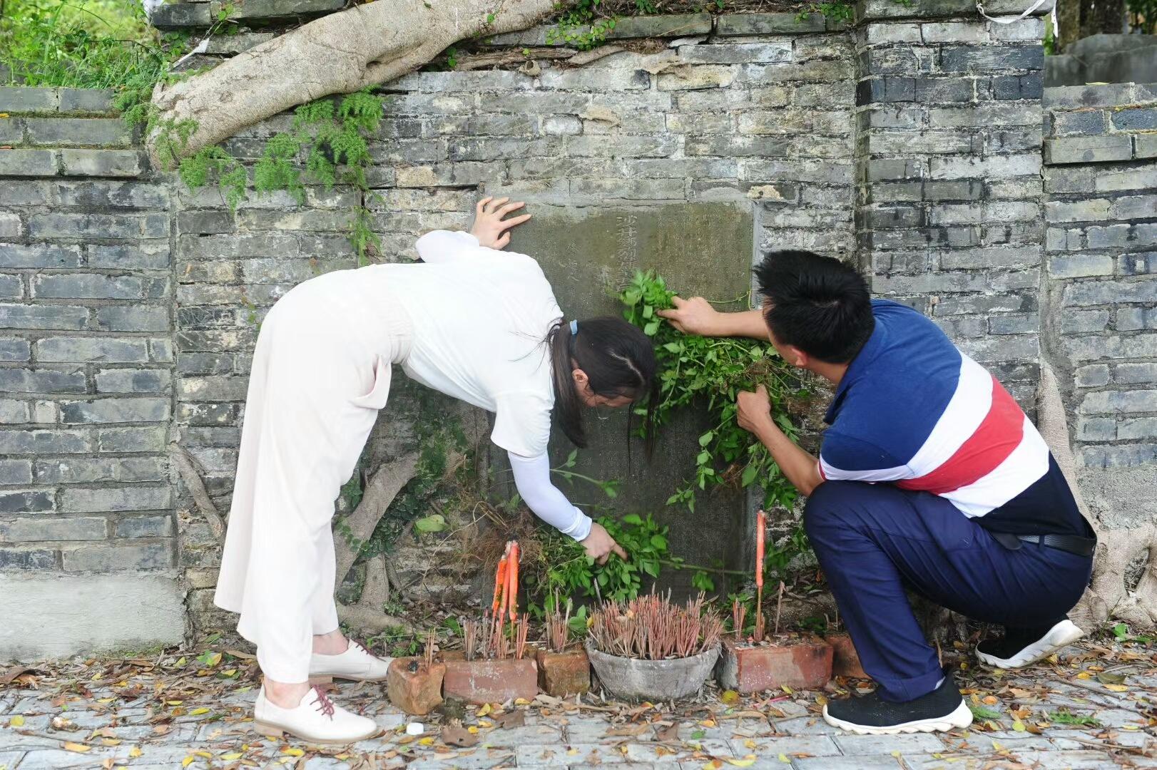 调研组老师用野草擦拭碑刻,方便读清楚碑文