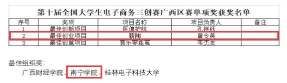 7月18日第十届全国大学生电子商务创新、创意创业挑战赛广西赛区选拔赛在桂林电子科技大学圆满闭幕南宁学院荣获一等奖2项、三等奖4项,最佳创业项目单项奖1项,同时与广西财经学院、桂林电子科技大学获评“最佳组织奖”取得该赛事新突破。