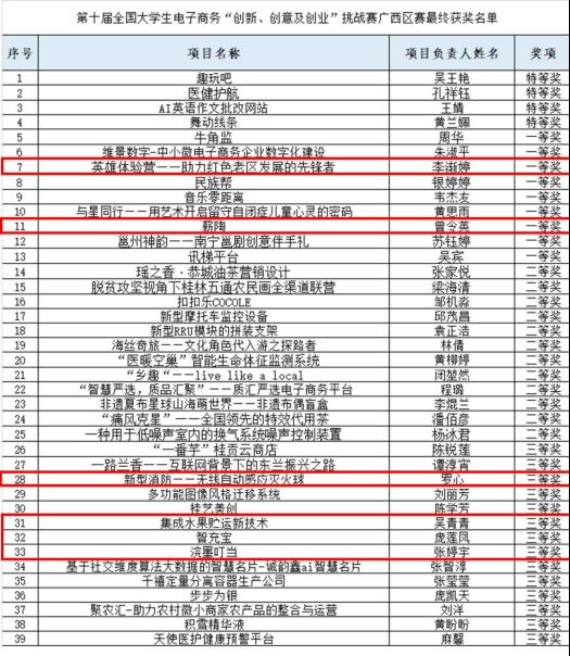 本次广西决赛采取线上路演答辩模式进行,校共7个项目进入决赛。经过一天路演答辩,《英雄体验营——助力红色老区发展的先锋者》《薪陶》荣获一等奖《新型消防——无线自动感应灭火器》《集成水果贮运新技术》《智充宝》《浣墨叮当》荣获三等奖其中《薪陶》项目被评为最佳创业项目