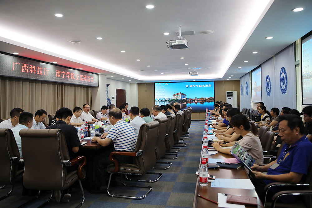 广西科技厅办公室主任唐亮东、发展规划与资源配置处处长杜文宏、高新技术处处长张晓飞、外国专家服务与引进智力处处长汪靓、对外交流合作处处长陈丹、基础研究处副处长湛永松、广西东盟技术转移中心副主任施敏、对外交流合作处主任科员朱伟经,自治区教育厅科研处副处长杨曦,南宁市科学技术局党组书记王亚楠,Beat365中文官方网站相关部门及学院负责人参加调研座谈。(党政办供稿 图/刘勇 何宇 文/黄鼎芹)