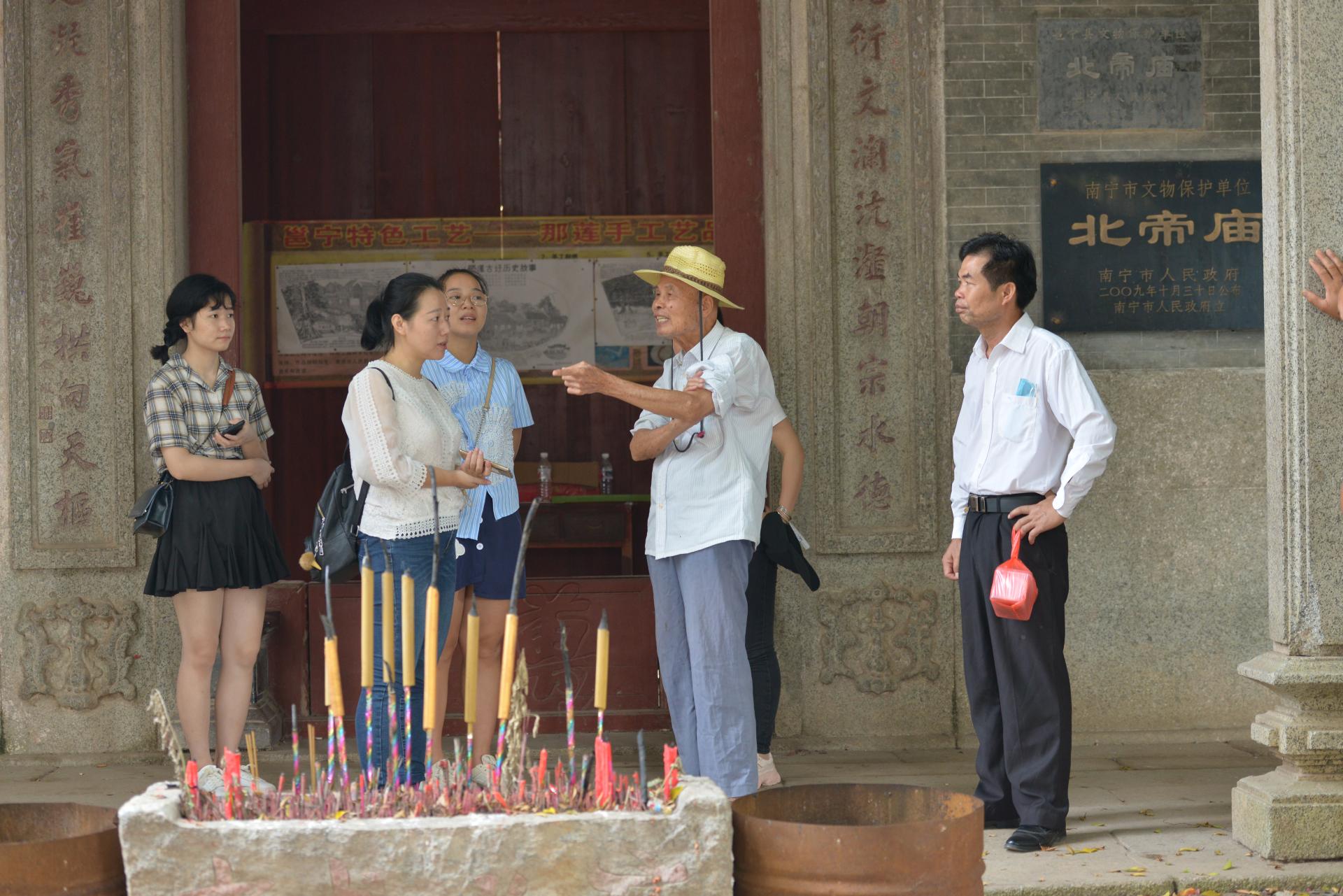 调研组采用现场考察和访谈的方式了解那连古圩、北帝庙会、七夕赛巧节、点米成画等民俗文化;那连村委得知调研组的此行目的后,村支部书记热情接待了调研组,带领调研组的老师和同学参观了孟莲村村史陈列馆,当地村民热情介绍了北帝庙的选址、那连戏台的盛况、那连古镇的节日等民情风俗。项目负责人从地理位置、宗庙建筑样式、石雕、木雕、花纹图案、文字符号等内容给调研小组的老师和学生介绍了那连北帝庙和那连戏台的建筑设计,介绍戏台传播文化的历史功能。随后,调研组成员到邕宁区蒲庙镇参观考察了五圣宫,调研了解五圣宫建筑结构、雕刻技艺、花纹图案、文字符号、修缮情况以及文物保护等情况。通过本次调研,调研组成员初步了解邕宁传统宗祠、庙宇文化,建立起传统文化传承与宗祠建筑多维度保护的意识。